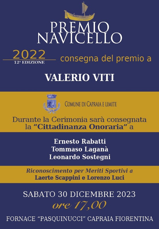 L'amministrazione comunale di Capraia e Limite invita la cittadinanza a partecipare alla cerimonia di consegna del "Premio Navicello 2022", massima onorificenza del Comune, in programma sabato 30 dicembre alle ore 17 presso la Fornace Pasquinucci a Capraia Fiorentina.