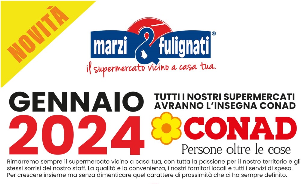 Sarà un nuovo anno ricco di novità, da Gennaio 2024 infatti tutti i nostri punti vendita Marzi&Fulignati avranno l’insegna Conad. Una nuova opportunità di crescita per ampliare i servizi alla comunità, con il passaggio ad un’insegna leader della distribuzione nazionale.