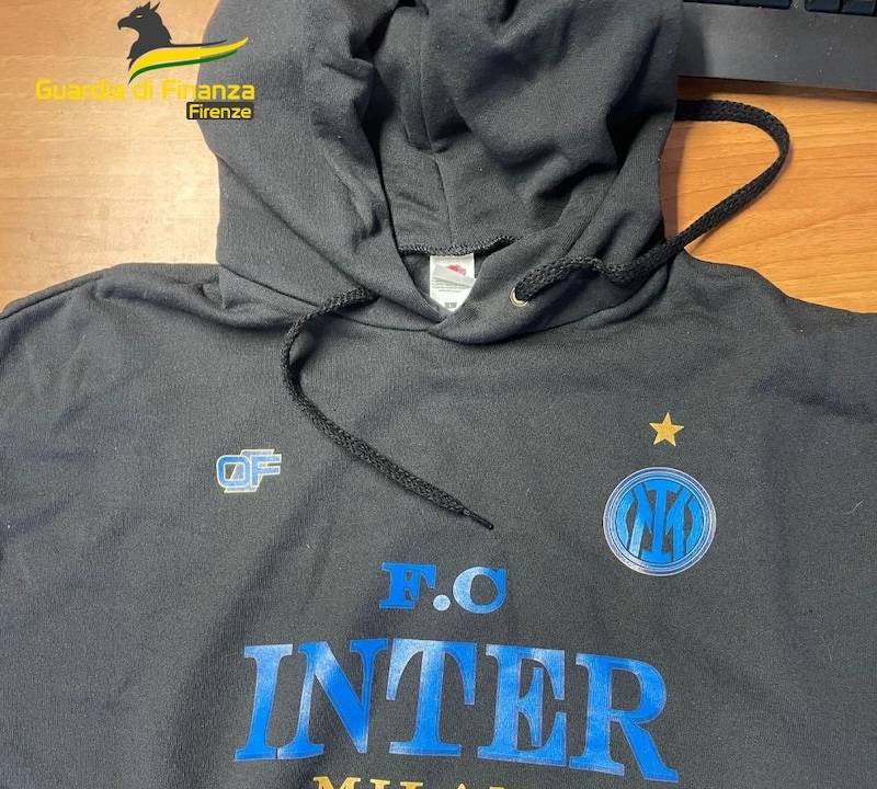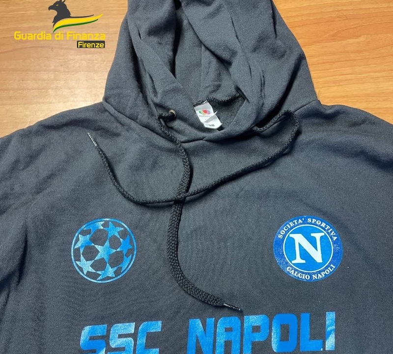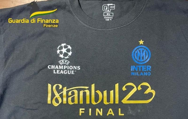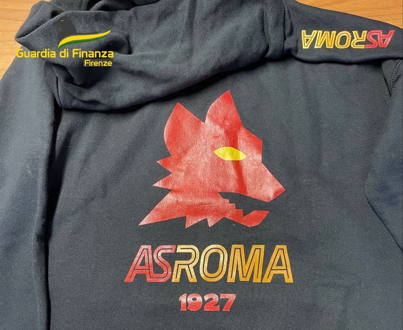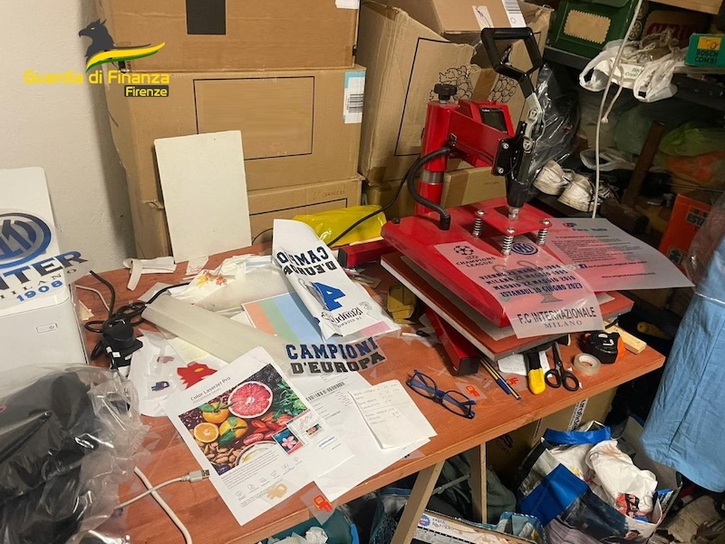 Maglie e felpe di Fiorentina, Roma, Milan, Inter, Juventus e Napoli. Divise che rimandavano alle finali di Champions e di Conference League con le squadre italiane protagoniste. Tutto però era falso, creato in un laboratorio alla periferia di Firenze e, curiosamente, a non lontano dal centro tecnico federale.