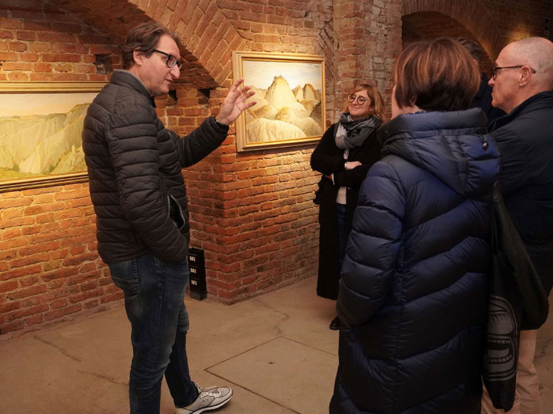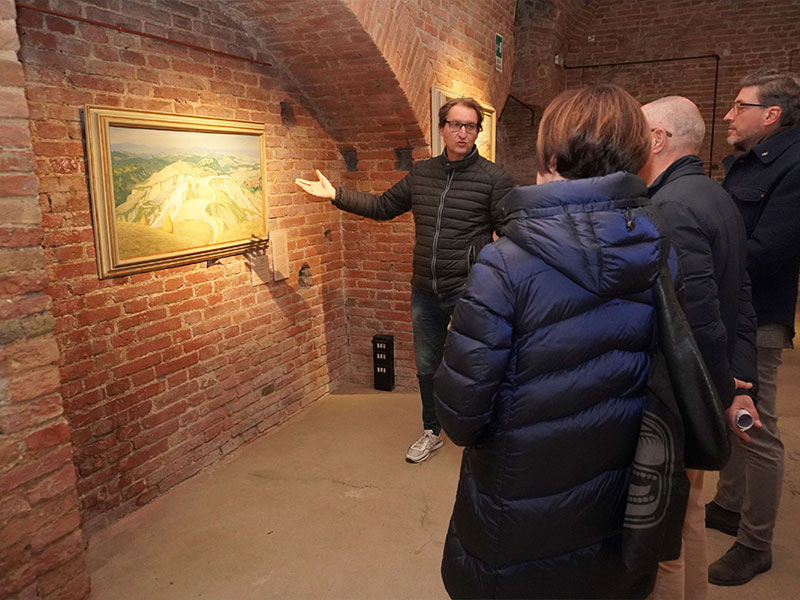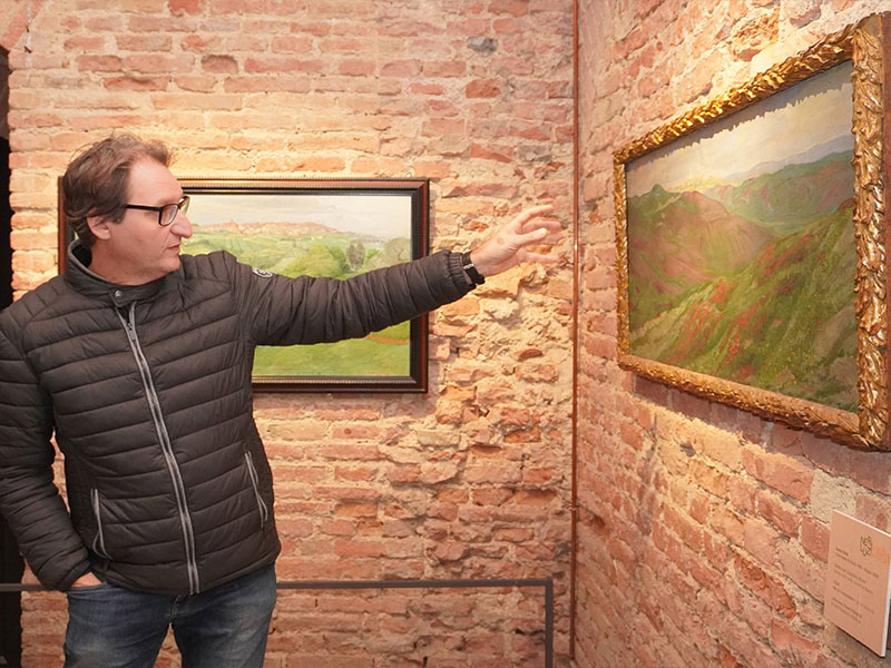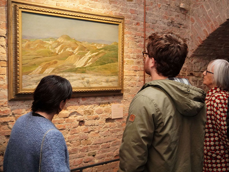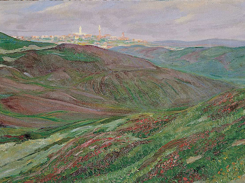 “Ci sono poi opere che documentano non solo i cambiamenti geologici ma anche le coltivazioni che il territorio accoglieva, associate a ben precise cromie. Penso – spiega il curatore – al rosso acceso della sulla, allora molto diffusa, che in alcuni dipinti come “Siena con la sulla in fiore”, del ’24, o ancora lo stesso “Sulla in fiore”, assume il ruolo di tratto distintivo. Oggi domina il giallo, il giallo oro delle coltivazioni estensive, per esempio cerealicole, che tendono a restituire le crete senesi con questa nota dominante. Oggi la sulla è quasi assente, andando verso Radi, si vede che è rimasta solo ai bordi della strada, dove il vecchio seme riesce ancora a risbocciare”.