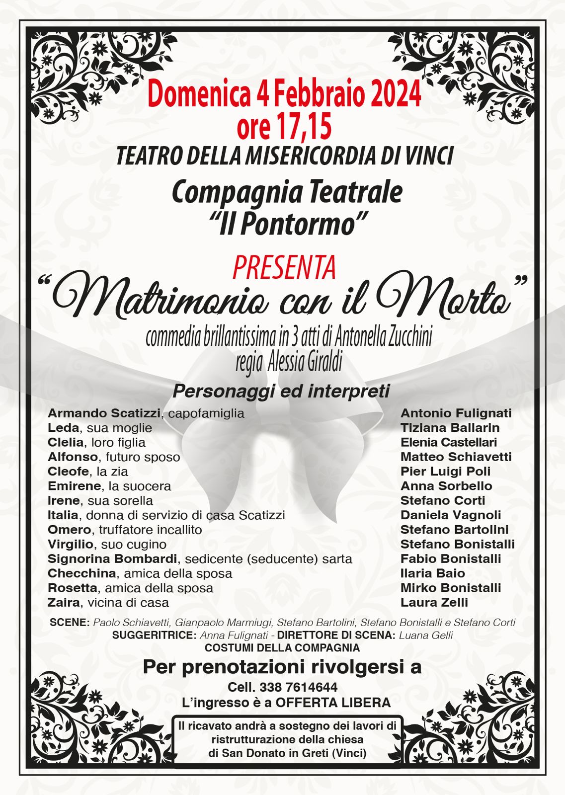 Domenica 4 febbraio alle ore 17.15 presso il teatro della Misericordia di Vinci si terrà lo spettacolo in vernacolo dal titolo "Matrimonio con il morto" a cura della compagnia teatrale "Il Pontormo" di Empoli.