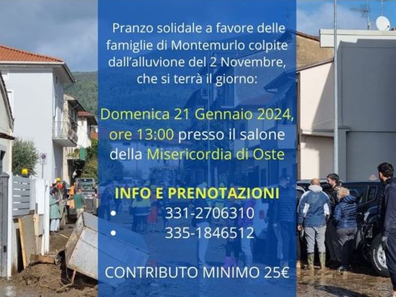 L’associazione “Montemurlo Solidale” e il Comune organizzano un pranzo il cui ricavato andrà a favore delle famiglie colpite dall’alluvione dello scorso 2 novembre. Domenica 21 gennaio alle ore 13 all’interno del salone della Misericordia di Oste in via Scarpettini 370, verranno accolti tutti coloro che vorranno partecipare in un contesto di socialità e solidarietà. A due mesi dall'alluvione a Montemurlo non si ferma la macchina della solidarietà e il mondo del volontariato continua a mobilitarsi per dare risposte concrete alle persone in difficoltà. « Fin dai primi momenti la comunità montemurlese ha risposto con grande partecipazione agli appelli per la solidarietà- commenta il presidente del Comitato Montemurlo solidale, Francesco Messineo – Sono già state raccolte circa 80 mila euro e in questi giorni è iniziata la distribuzione dei buoni acquisto per gli elettrodomestici a chi ha avuto la casa allagata. Le necessità delle famiglie sono ancora tante e il pranzo rappresenta un'occasione per far sentire concretamente la propria vicinanza ai nostri concittadini coinvolti dall’alluvione». L’associazione “Montemurlo Solidale” propone una quota di partecipazione minima di 25 euro per accumulare la somma che verrà poi destinata alle famiglie Per informazioni e prenotazioni sono stati messi messi a disposizione i numeri 331-2706310 e 335-18446512.