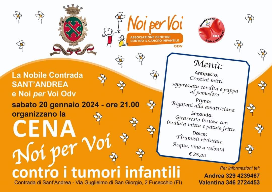 Il 20 gennaio, alle ore 21, la Nobile Contrada Sant'Andrea e Noi per Voi Onlus organizzano una cena di beneficienza contro i tumori infantili. Tutti i fondi raccolti saranno devoluti alla ricerca per sconfiggere questa terribile malattia che colpisce i bambini. La serata sarà allietata da buon cibo e ottimo vino, ma soprattutto dalla solidarietà di tutti coloro che parteciperanno.