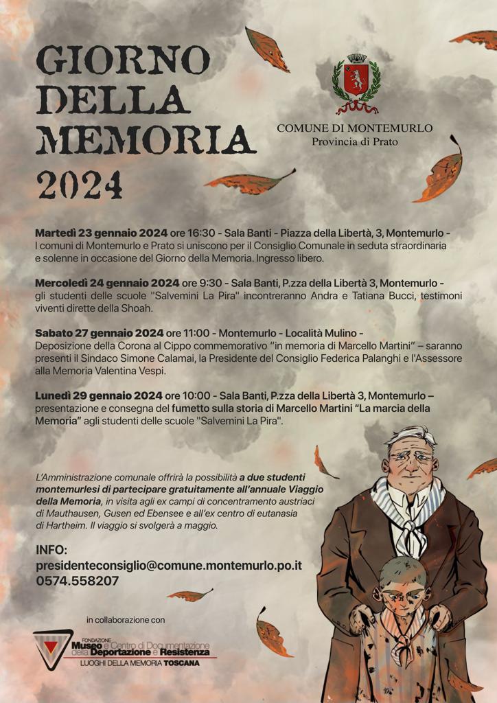 I Consigli comunali di Prato e Montemurlo celebrano il “Giorno della Memoria 2024” con una seduta solenne e congiunta, che si svolgerà martedì 23 gennaio ore 16,30 al teatro della Sala Banti (piazza della Libertà- Montemurlo) Interverranno Enrico Iozzelli del Museo della Deportazione e Resistenza di Prato, Emanuele Fiano, terzo e ultimo figlio di Nedo Fiano (1925-2020), ebreo deportato ad Auschwitz e unico superstite di tutta la sua famiglia, oltre che ex deputato, e lo storico e scrittore Carlo Greppi, che nel 2023 ha pubblicato “Un uomo di poche parole. Storia di Lorenzo, che salvò Primo”, una biografia di Lorenzo Perrone, il muratore di Fossano che ad Auschwitz aiutò sistematicamente Primo Levi, permettendogli di sopravvivere al lager. Seguiranno gli interventi dei gruppi consiliari dei due Comuni e dei sindaci di Prato, Matteo Biffoni e di Montemurlo, Simone Calamai.
