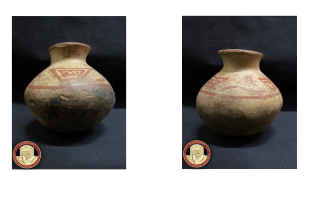 Una coppa integra in ceramica, in stile Lagarto, di 10 per 8 per 4 centimetri, con un’ansa verticale rialzata e la parte superiore del corpo riportante una decorazione dipinta, risalente ad un periodo massimo tra il 1000-1200 d.C. riconducibile alla cultura dei Gran Chiroquì. Valeva 5mila euro. Era in una collezione privata di un professionista poi deceduto. È stato trovato e restituito dai carabinieri all'ambasciatore di Panama perché appartenente al patrimonio nazionale dello stato centroamericano.