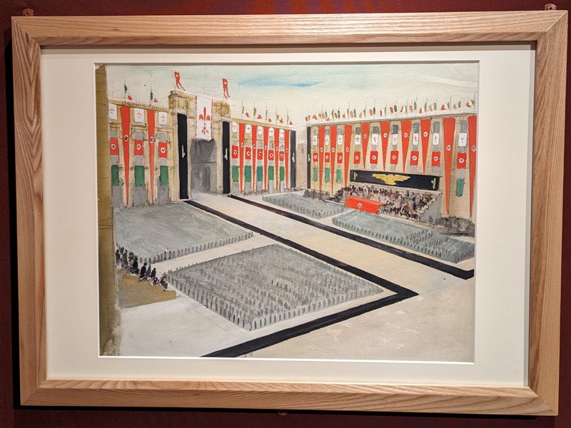 La visita ufficiale di Adolf Hitler a Firenze si svolse il 9 maggio 1938. Dopo Roma e Napoli, la cosiddetta ‘Festa del saluto’ prevedeva che il Fuhrer, Mussolini e i principali membri della gerarchia nazista, attraversassero una città ornata da migliaia di vessilli con fasci littori svastiche e altre decorazioni. Mentre si intensificavano gli arresti dei dissidenti, un gruppo di giovani artisti diretti dal pittore Silvio Polloni fu incaricato del bozzetti per la generale opera di maquillage del centro storico. Le tribune d'onore vennero poste in piazza Vittorio Emanuele II (attuale piazza della Repubblica) esattamente là dove sorgeva il ghetto. La tragica coincidenza spaziale che lega il bozzetto al ghetto di Firenze evoca e anticipa la tragedia della Shoah.