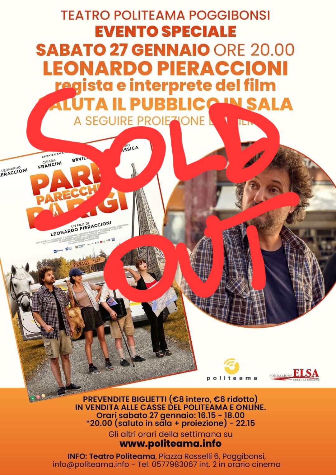 Esauriti i biglietti per la proiezione di sabato 27 gennaio alle 20,00 nella sala maggiore del Teatro Politeama di Poggibonsi con la presenza del regista e attore Leonardo Pieraccioni per il saluto introduttivo al suo ultimo film Pare parecchio Parigi.
