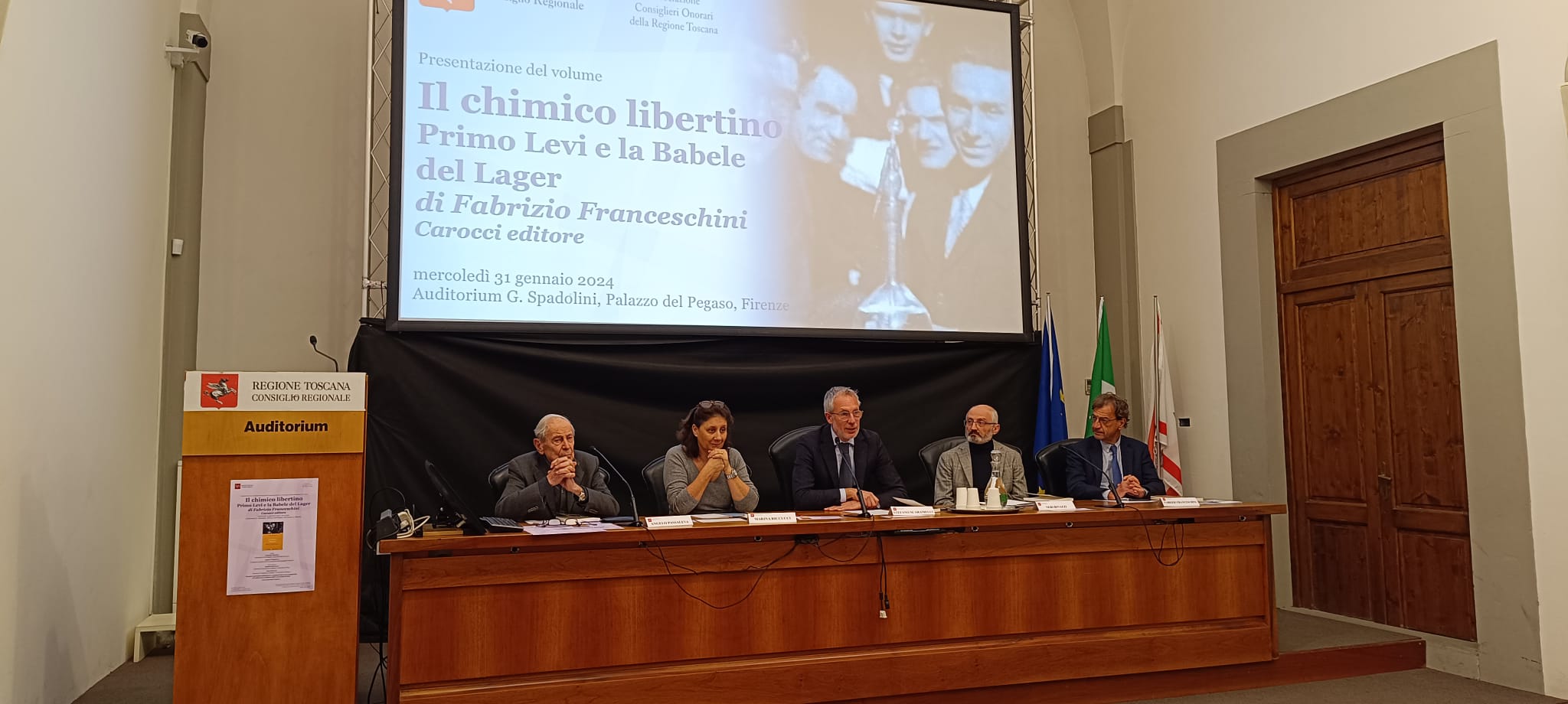 All’auditorium Spadolini di palazzo del Pegaso è stato presentato il libro “Il chimico libertino. Primo Levi e la Babele del Lager” di Fabrizio Franceschini. Sono intervenuti Angelo Passaleva, presidente emerito dell’Associazione dei Consiglieri Onorari, Stefano Scaramelli, vicepresidente del Consiglio regionale, Marina Riccucci, docente di Letteratura italiana (Università di Pisa), Neri Binazzi, docente di Linguistica italiana (Università di Firenze). Erano presenti studentesse e studenti del corso magistrale di Letteratura italiana dell’Università di Pisa.