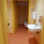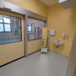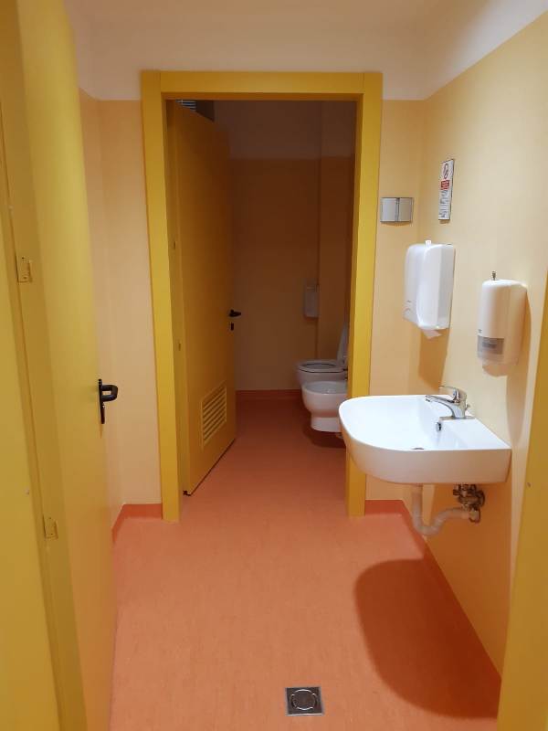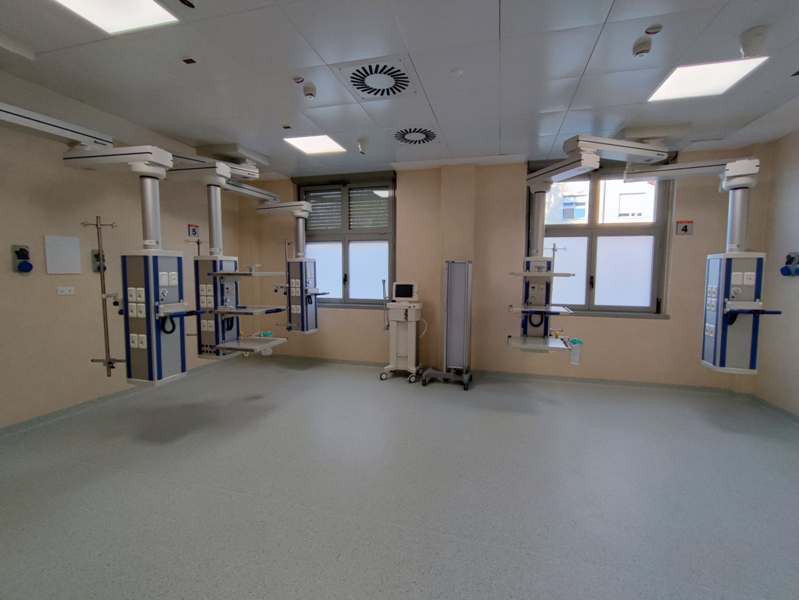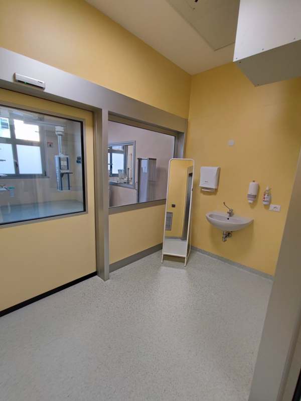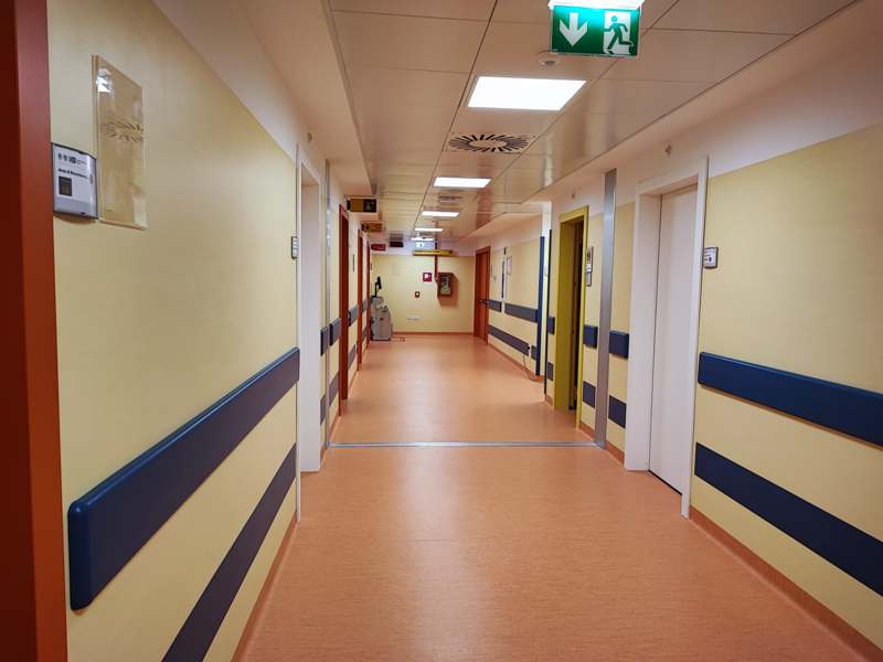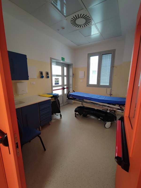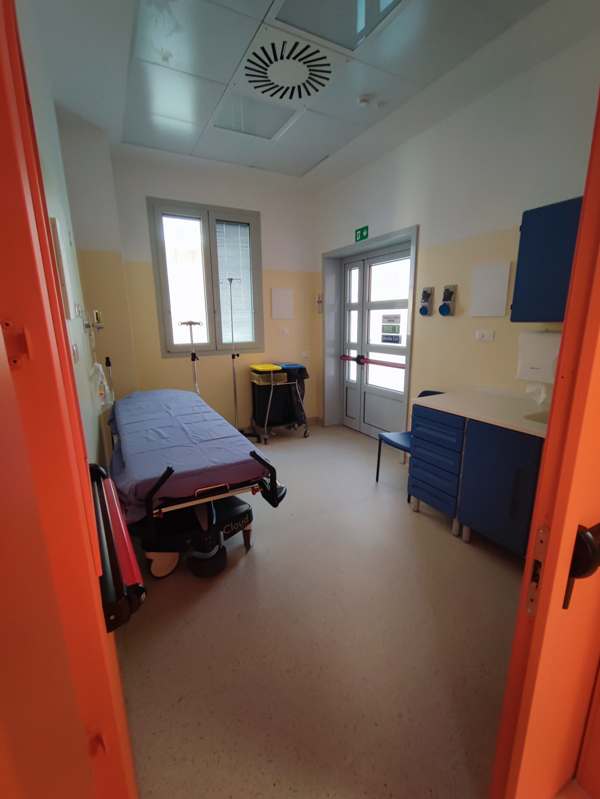 L’altro intervento è consistito nella riconversione di un reparto di degenze al piano primo dell’edificio 30 in un reparto di terapia semi-intensiva dotato di 12 posti letto. I lavori hanno riguardato la modifica distributiva degli ambienti, il rifacimento integrale degli impianti elettrico, di trasmissione dati e di trattamento aria per il controllo dei gradienti di pressione, e la nuova distribuzione dell’impianto dei gas medicinali e testa-letto. La dotazione impiantistica degli ambienti (gradienti pressori di 10 Pa, sia in depressione sia in sovra-pressione, impianti gas medicinali, 15 ricambi d’aria orari, filtri ad alta efficienza HEPA) e l’organizzazione funzionale degli spazi consentono di poter utilizzare i 12 posti letto anche come letti di terapia intensiva. In ognuna delle quattro camere (ciascuna da tre posti) gli spazi sono stati studiati in modo opportuno per consentire agevoli manovre assistenziali sui quattro lati dei letti, è presente un servizio igienico interno accessibile e l’entrata avviene tramite filtro, opportunamente pressurizzato per mantenere i diversi regimi di pressione, con dimensioni tali da consentire la vestizione del personale. In questo reparto si trasferiranno le degenze dell’Unità operativa ospedaliera di Medicina d’urgenza e pronto soccorso, finora ubicate all’Edificio 31 (sopra il Pronto soccorso).