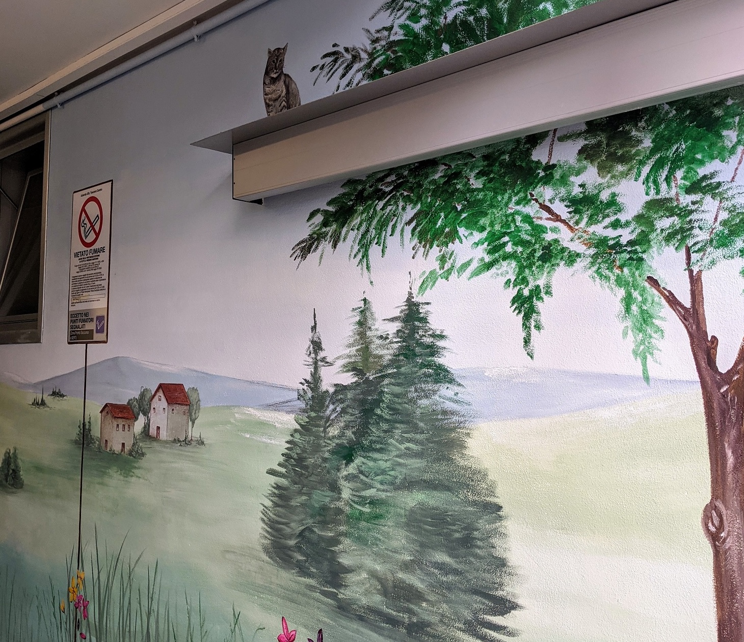 Per questa stessa ragione le decorazioni scelte per le pareti sono ricadute sulla tecnica del "trompe d’oeil", un genere di pittura che amplifica illusoriamente lo spazio di un ambiente. Il tema scelto per l'affresco e per l'umanizzazione dell'intero reparto è il paesaggio del Chianti, a sottolineare il legame con il meraviglioso territorio circostante l'Ospedale.