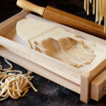 Il tonnarello è un tipo di pasta in cui è importante cercare di mantenere uno spessore uniforme, in modo da non avere tempi di cottura diversi. Se abbiamo la chitarra per la pasta fresca, questa procedura è molto semplice perché basterà poggiare la pasta stesa sulle corde e fare pressione per formare tante striscioline. Se non avete questo strumento potete tagliare a mano la pasta usando un piccolo trucco: pieghiamo il foglio di pasta in 3 lungo uno dei due lati e con un coltello tagliamo delle striscioline lungo l’altro lato, quello più corto. In questo modo, con un unico colpo di coltello taglieremo la sfoglia lungo tutta la sua lunghezza e sarà facilissimo tenere lo spessore uniforme.