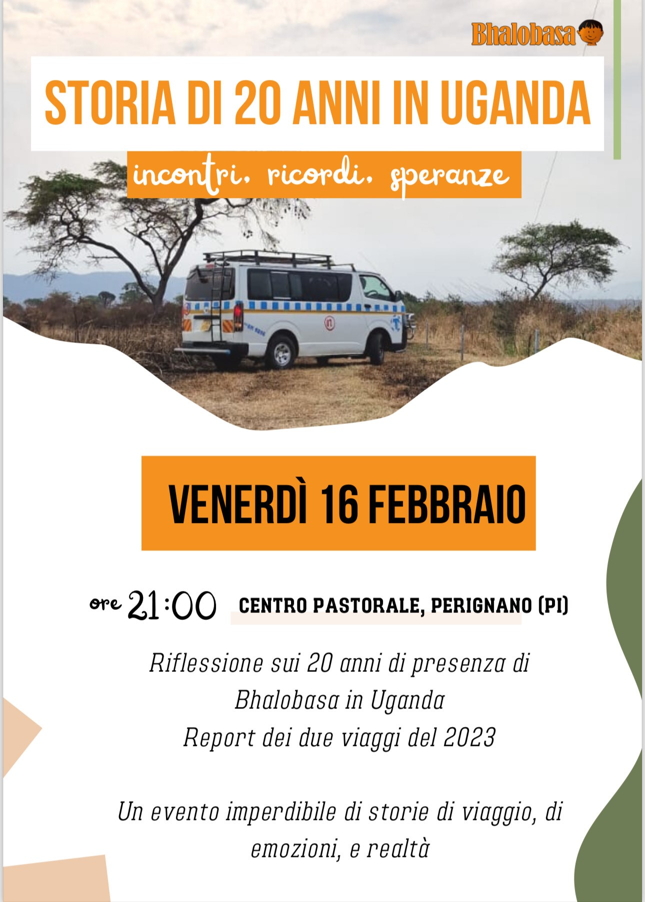 Don Armando parlerà di Bhalobasa negli anni Duemila e della scelta di andare oltre l'India, il vicepresidente di Bhalobasa, Matteo Ferrucci, e uno dei primi e più importanti volontari, David Pistolesi, racconteranno il primo viaggio. Giovanni Carmignani, responsabile del settore progetti tesserà una storia dei progetti di Bhalobasa nel Paese, Simone Del Cesta, responsabile dei SaD, farà lo stesso con i sostegni a distanza. Stefania Bagnoli, volontaria estremamente esperta, ci farà rivivere la festa a Kampala questa estate, alcuni volontari narreranno storie e incontri particolarmente significativi. Concluderanno i due presidenti, Cipriano e Ferrucci. La partecipazione è libera e gratuita, per informazioni: bhalobasa.it e comunicazione@bhalobasa.it.