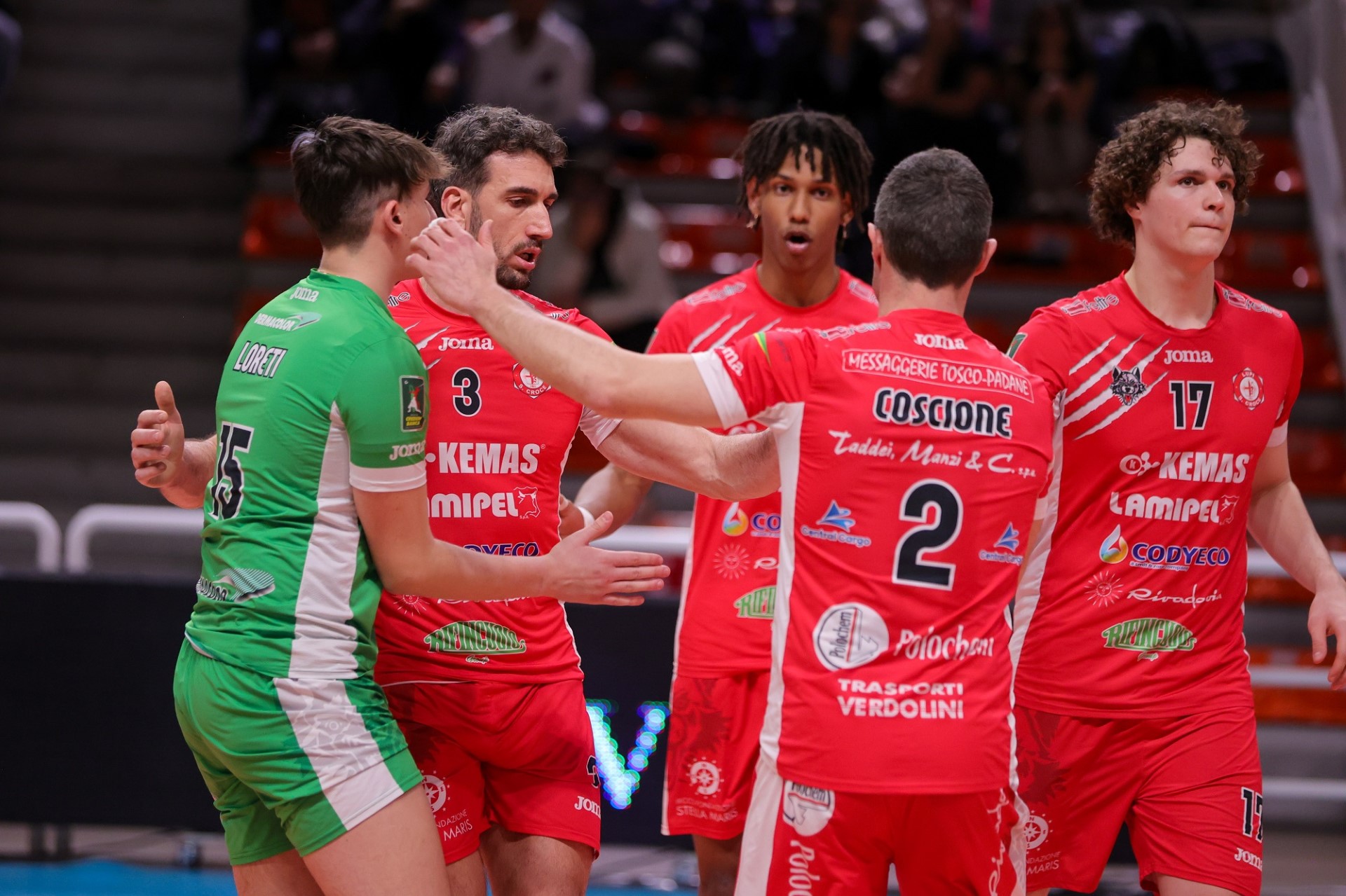 4 set. Come nel secondo set, la Kemas Lamipel ritrova incisività al servizio e ordine a muro. La bilancia torna a pendere dalla parte degli ospiti. Un turno al servizio d Colli scava il break portando i ragazzi di Bulleri sul 7-11. Kemas Lamipel prende margine, un ace di Lawrence segna il 9-15. L’opposto numero 23 concede il bis sulla palla successiva, 9-16. Denora lancia nella mischia Bacco al posto di Galliani, poi prova anche il doppio cambio con Gianotti e Quagliozzi. I padroni di casa, sotto pressione, commettono molti errori. Una difesa di Cargioli propizia un grande attacco di Lawrence, alto sulle mani: 11-19. I Lupi giocano sul velluto, con vantaggi importanti. Parodi riceve “perfetta”, Coscione alza una gran palla a Mati, 13-21. Sul più bello due attacchi ospiti fuori misura creano un po’ di apprensione e i locali ne approfittano per provare la rimonta: 17-21, time-out Bulleri. Ancora Lawrence fuori in diagonale, poi gran muro di Bacco e Monguzzi. Dentro Gatto. Il sideout lo firma Parodi, poi Brucini rileva Mati dai 9 metri ma il punto lo fa ancora una volta la Pool Libertas. Un muro di Cargioli fa respirare i biancorossi, mentre rientra Lawrence. Cargioli guadagna il set-point mentre Bulleri avvicenda Parodi con Allik per il servizio decisivo. 21-24. Ottaviani annulla. La palla successiva la risolve Colli con un gran colpo in attacco.