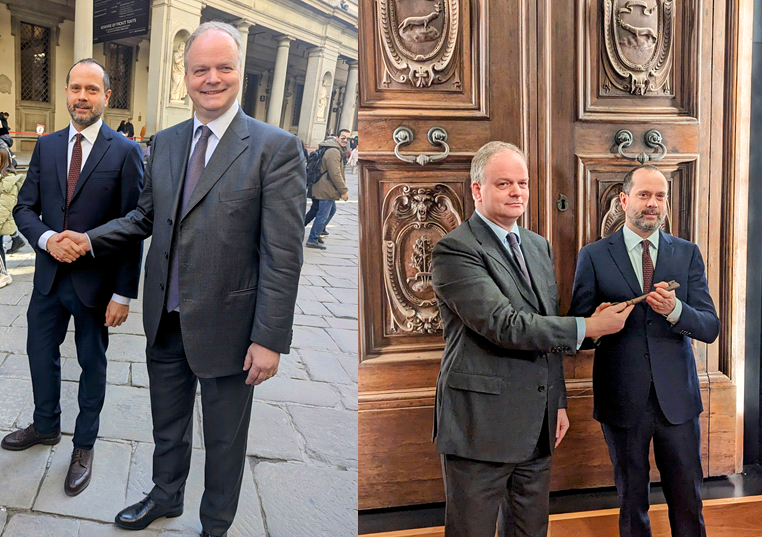 Passaggio di consegne alle Gallerie degli Uffizi: il nuovo direttore Simone Verde ha oggi ricevuto simbolicamente nell'auditorium del museo proprio oggi intitolato ad Antonio Paolucci (scomparso il 4 febbraio scorso) la chiave dell'antico portone del museo dal suo predecessore, e attuale direttore del Museo e Real Bosco di Capodimonte, Eike Schmidt. L'evento si è tenuto nello stesso auditorium, poco dopo che i direttori avevano scoperto, nel loggiato della Galleria, la targa con l'intitolazione al grande storico dell'arte.