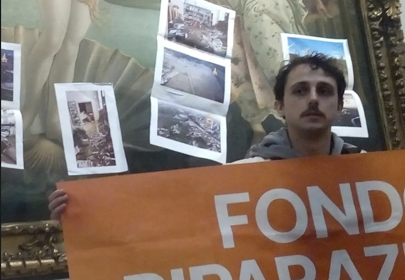 La Nascita della Venere di Botticelli, capolavoro del Rinascimento esposto agli Uffizi, è stato oggetto di un'azione da parte di due militanti di Ultima Generazione. I due hanno ricoperto nel pomeriggio di martedì 13 febbraio il quadro nel museo di Firenze con immagini delle alluvioni di Campi Bisenzio, attaccate con scotch di carta alla teca che protegge il dipinto. Il personale del museo ha fatto uscire i turisti, spento le luci e chiuso la sala. I carabinieri hanno raggiunto i due attivisti e li hanno fermati, adesso i due sono in caserma.