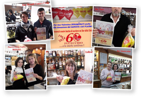 In occasione di San Valentino, festa degli innamorati, nei bar e nelle pasticcerie di Fucecchio sarà possibile trovare le simpatiche bustine di zucchero a forma di cuore offerte dal Gruppo Fratres.