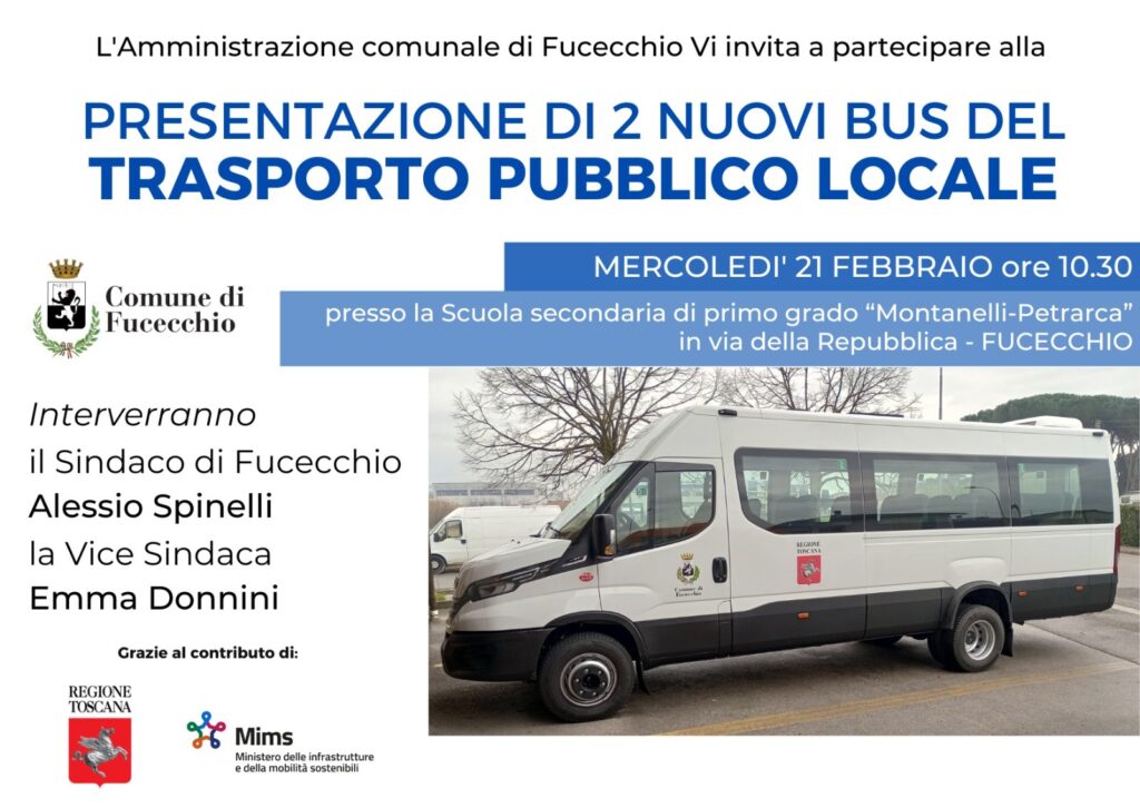 Due nuovi mezzi moderni per il trasporto pubblico locale andranno a sostituire due vecchi pulmini destinati alla rottamazione. Grazie al bando sulla mobilità della Regione Toscana, il Comune di Fucecchio è riuscito ad ottenere i fondi - in parte regionali e in parte statali - per l'acquisto di due nuovi bus da destinare al servizio di Trasporto Pubblico Locale. Si tratta di un pulmino da 25 posti alimentato a metano e di uno più piccolo, da 20 posti, alimentato a gasolio. I mezzi, già a disposizione dell'amministrazione comunale, saranno presentati mercoledì prossimo 21 febbraio alle ore 10,30 di fronte alla scuola secondaria di primo grado Montanelli Petrarca, in via della Repubblica, alla presenza del sindaco Alessio Spinelli e della vicesindaca e assessore alla scuola Emma Donnini.