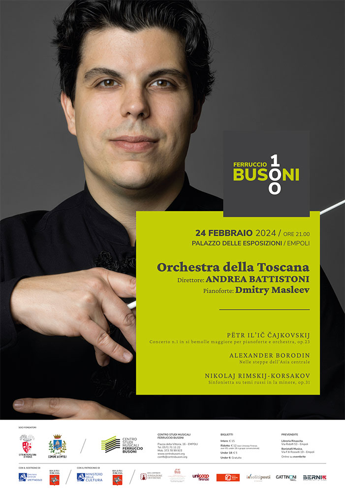 Dalle note del Gamo Ensemble ecco un nuovo appuntamento della rassegna musicale “Busoni 100” che sta regalando emozioni. Sabato 24 febbraio 2024, al palazzo delle Esposizioni, in piazza Guido Guerra a Empoli, alle 21, l’Orchestra della Toscana, sotto la direzione di Andrea Battistoni e Dmitry Maaslev al pianoforte, eseguirà un programma tutto dedicato ai compositori russi Čajkovskij, Borodin e Rimskij-Korsakov.