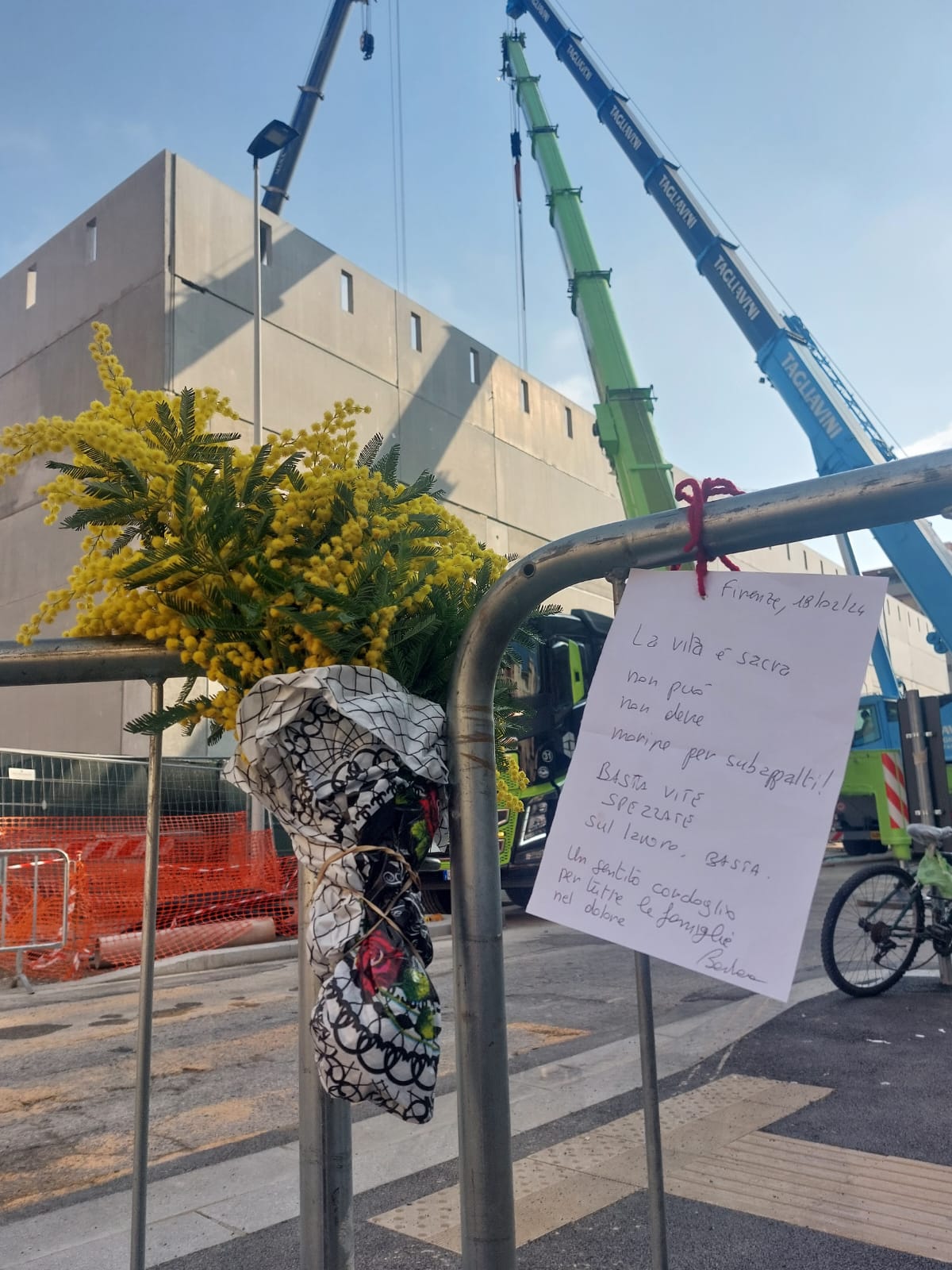 Dopo la fiaccolata di ieri sera di fronte al cantiere di via Mariti, questa mattina vari mazzi di fiori e cartelli sono apparsi nell'area transennata dove 5 operai hanno perso la vita e un sesto risulta ancora disperso tra le macerie.