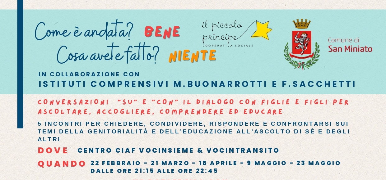 Al via un nuovo ciclo di incontri informativi sull’infanzia e l’adolescenza, a cura degli educatori del Centro infanzia adolescenza e famiglie Vocinsieme e Vocintransito in collaborazione con gli Istituti Comprensivi Sacchetti e Buonarroti. “Com’è andata? Bene – Cosa avete fatto? Niente” è un'iniziativa rivolta alle famiglie degli alunni delle scuole del comune di San Miniato, uno spazio per creare momenti di confronto e di riflessione.