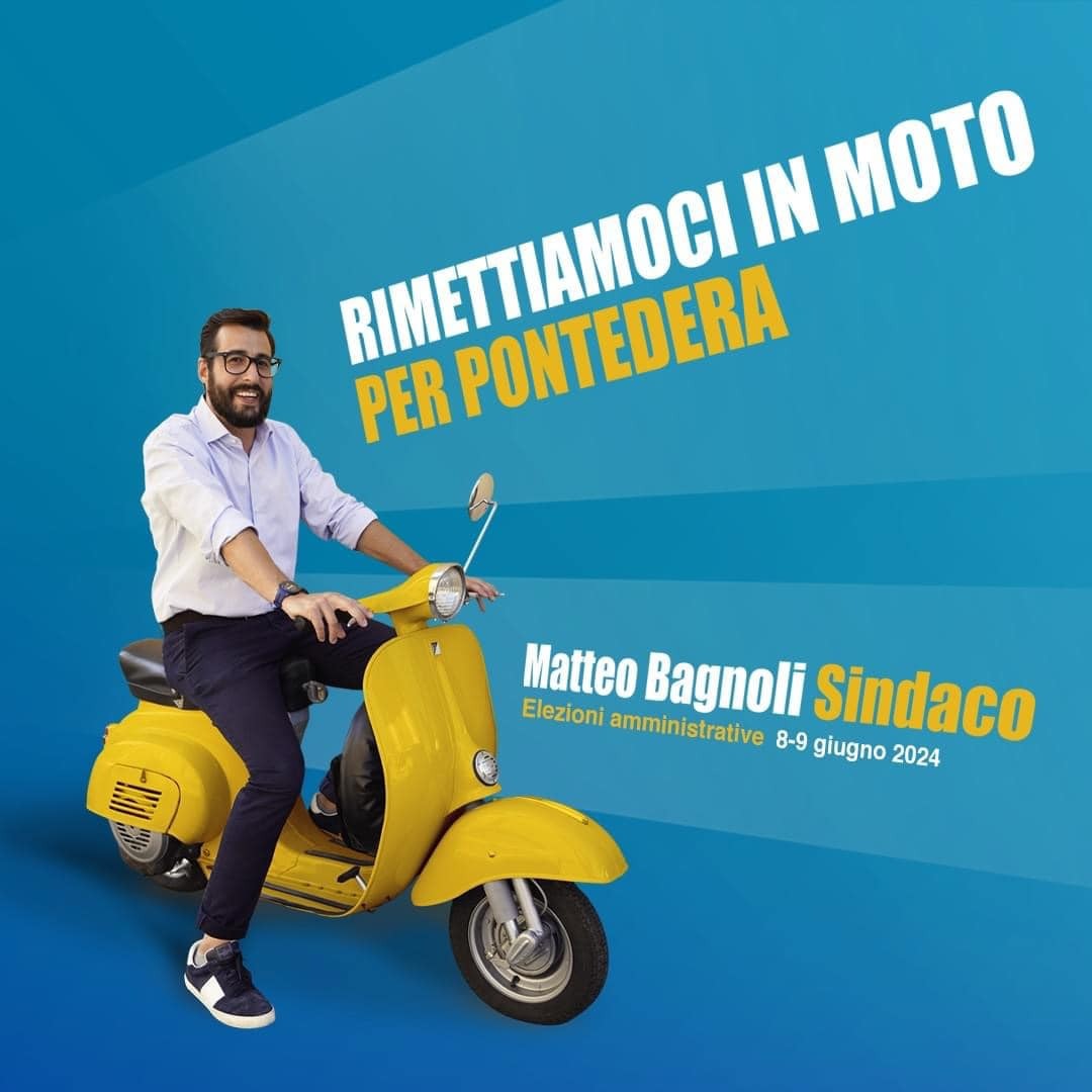 Il candidato sindaco di Pontedera della destra (nel 2019 e nel 2024), Matteo Bagnoli, ha fatto più volte riferimento alla Vespa, vero simbolo cittadino. Eccolo con la Meloni nel 2019 e oggi, da solo.