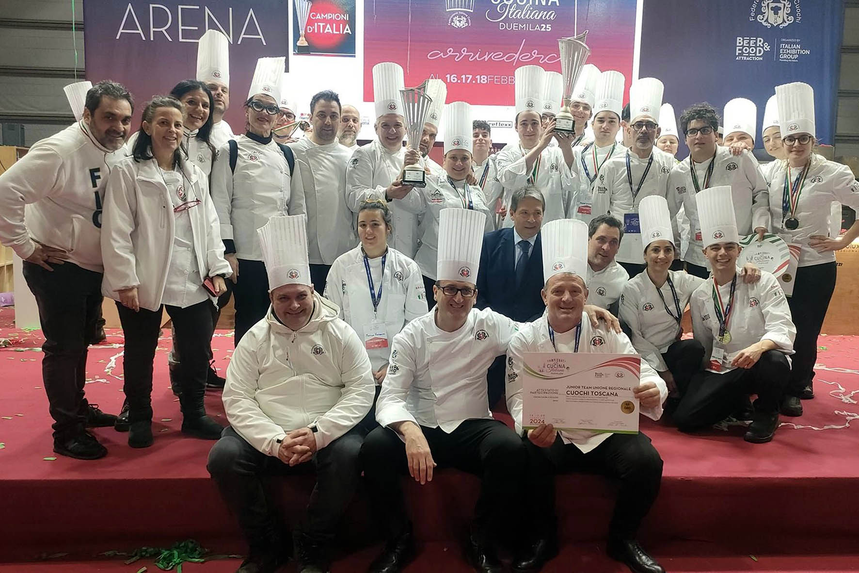 La partecipazione dell’Unione Regionale Cuochi Toscani è stata arricchita anche da altri risultati di rilievo quali l’oro assoluto nella categoria K1 Senior della chef Denise Massarenti dell’Associazione Cuochi Arezzo e l’oro nella categoria K2 Senior dello chef Sergio Acquaviva dell’Associazione Cuochi Senesi. La competizione Miglior Allievo è terminata con l’argento per Alessio Dani mentre Francesca Bartoli dell’Associazione Cuochi Arezzo ha ottenuto un bronzo nella competizione Miglior Lady Chef d’Italia, inoltre la Toscana era presente anche nella categoria Ragazzi Speciali con il team composto da Alen Doci e Paolo Fastelli dell’IIS "Pellegrino Artusi" di Chianciano Terme. Le competenze degli chef toscani sono state riconosciute anche in altre gare individuali dagli argenti di Giada Ferri e Gabriele Mazzanti dell’Associazione Cuochi Pisani, dai bronzi di Antonio De Roma, Edoardo Del Colletto, Diego Cassisa e Samuele Caciagli dell’Associazione Cuochi Pisani, e dai diplomi per Martina Vangelisti e Giulio Amato dell’Associazione Cuochi Pisani e per Riccardo Pucci dell’Associazione Cuochi Grosseto. Il cammino dell’Unione Regionale Cuochi Toscani è stato supportato anche dalla Regione Toscana che, attraverso Toscana Promozione Turistica e Vetrina Toscana, è stata presente con uno stand dedicato al turismo e all’enogastronomia, oltre che dai maggiori Consorzi di Tutela: Pecorino Toscano DOP, Pane Toscano DOP, Prosciutto Toscano DOP, Finocchiona IGP, Olio Toscano IGP e Vitellone Bianco dell’Appennino Centrale IGP. "Abbiamo creduto nel mondo dei giovani e i risultati ci hanno dato ragione - conclude Lodovichi. - L’avvicinamento al mondo della ristorazione di ragazzi e ragazze di talento animati da dedizione, serietà e umiltà è motivo di orgoglio e fiducia verso il futuro. La collaborazione con il mondo della scuola e con le istituzioni fortifica quella progettualità di sistema che stiamo alimentando da anni e che passa attraverso professionisti che danno concretezza alle idee e che vorremmo caratterizzasse la "Toscana del fare" che portiamo quotidianamente nel nostro lavoro ma anche in ogni evento a cui partecipiamo".