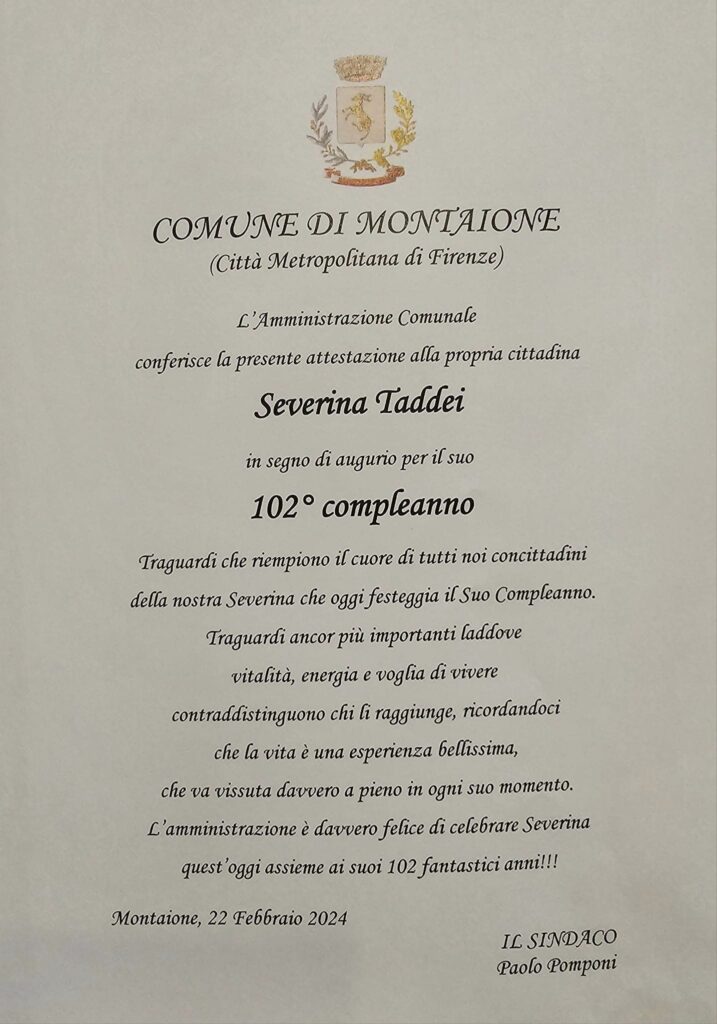 Un compleanno speciale a Montaione. La signora Vera ha compiuto 102 anni, un traguardo davvero importante. Vera, all'anagrafe Severina, è una fra le cittadine montaionesi meno giovani (solo 'Maria' ha 6 mesi piu di lei) ma è sicuramente la centenaria più 'in forma', da ogni punto di vista. Questa mattina le ha portato i suoi auguri anche il sindaco Paolo Pomponi che ha consegnato a Vera un omaggio floreale e una pergamena che esprime con parole toccanti il senso di questa visita.
