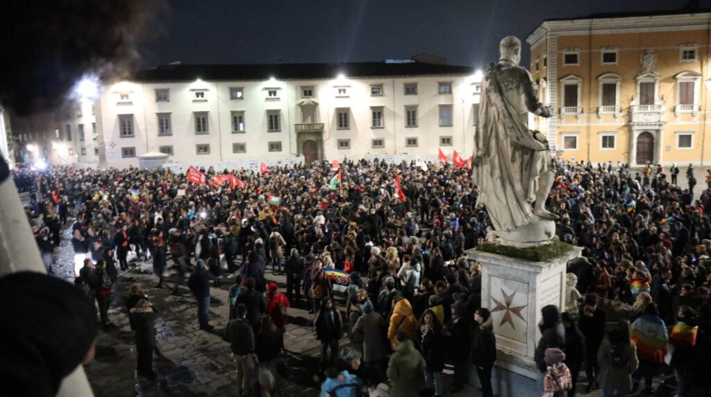 Un presidio in solidarietà ai ragazzi e alle ragazze: "Le istanze della pace non devono mai sfociare in atti di violenza. Richiediamo la massima tutela dei diritti e delle libertà costituzionali come la libera manifestazione delle opinioni di tutte le persone" viene spiegato. Al presidio stanno partecipando Coordinamento Civico e Progressista, Pd, La citta delle persone, Si, Sinistra civica ecologista, Pisa Possibile, +Europa di Pisa, Cascina e Pontedera, Riformisti per Pisa, M5s, Psi di Pisa, Possibile Pistoia, Democratici Riformisti per San Giuliano Terme, Riformisti per San Miniato, Acli provinciali di Pisa e Lucca, Cittadinanzattiva Pisa, Associazione Barone Rampante, Associazione Orizzonte Comune di Crespina-Lorenzana. Un altro presidio, "contro la repressione" si sta invece svolgendo, sempre dalle 18, davanti al comune di Pisa promosso dalla Federazione Toscana e dalla sezione di Pisa del Partito dei Carc.