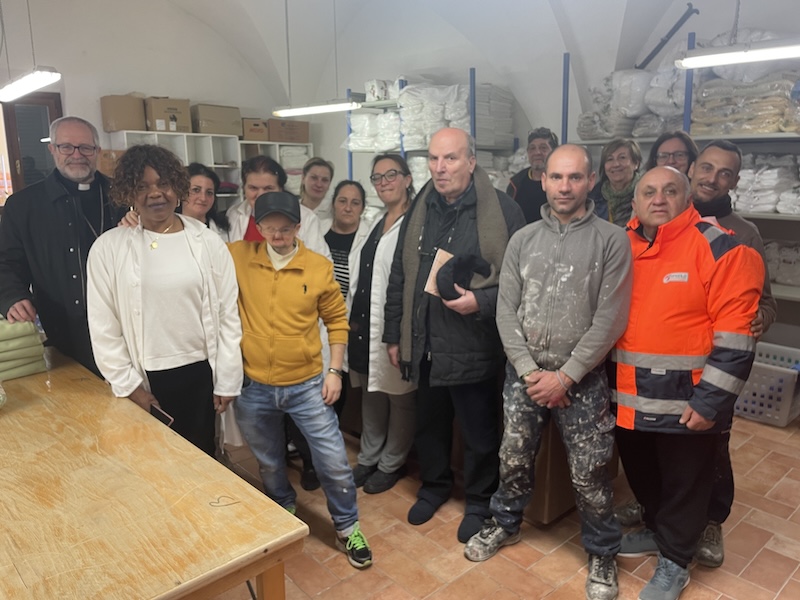 Laboratorio di cucito e lavanderia, il vescovo Paccosi in visita ai progetti di inclusione nel Cuoio