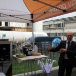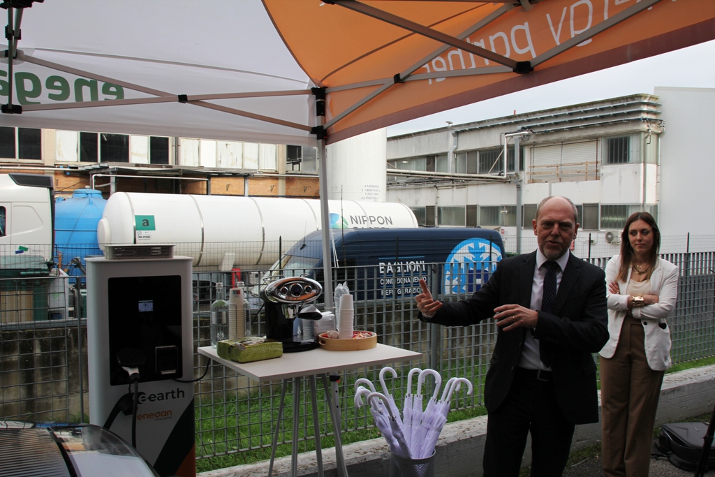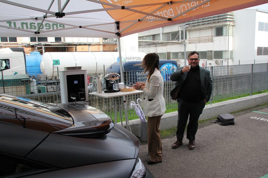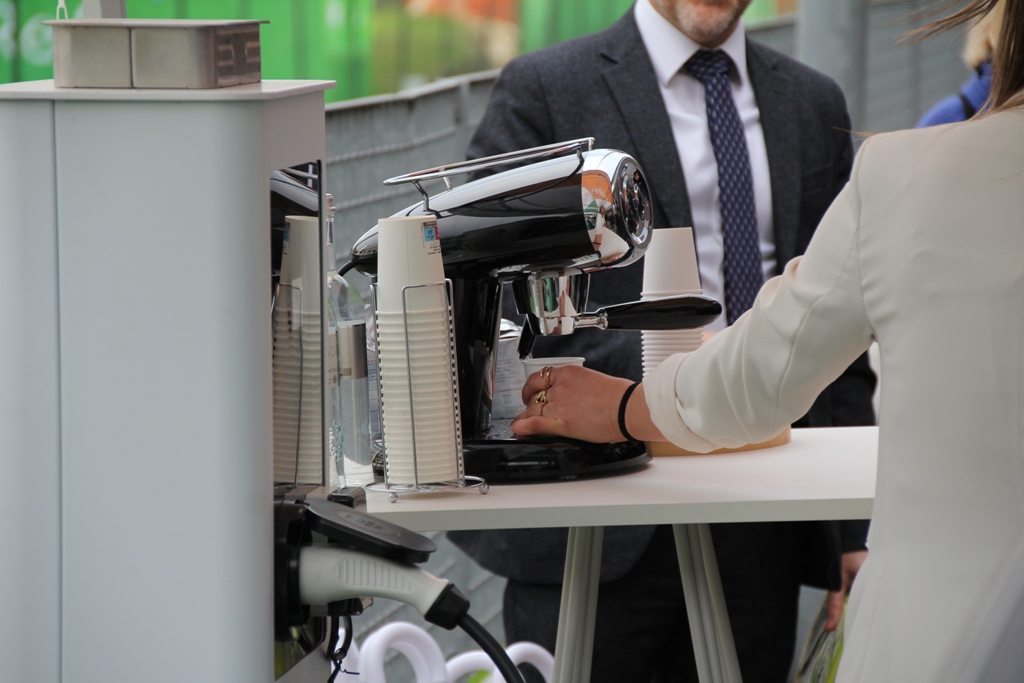 E proprio durante la conferenza stampa, un'auto elettrica collegata alla V2G ha provveduto ad alimentare una macchinetta del caffè per offrire caffè ai presenti.