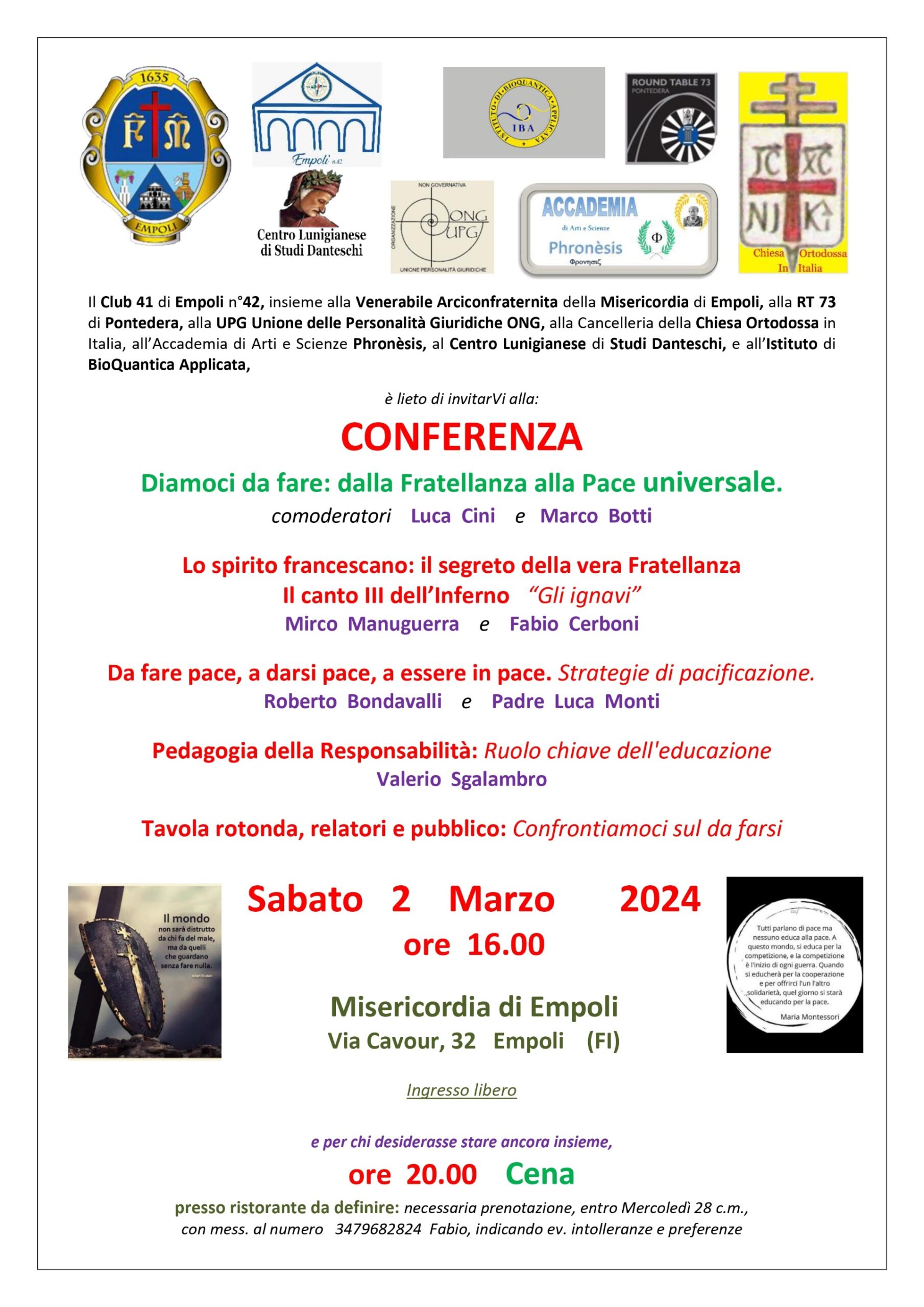Il Club 41 di Empoli n°42, insieme alla Venerabile Arciconfraternita della Misericordia di Empoli, alla RT 73 di Pontedera, alla UPG Unione delle Personalità Giuridiche ONG, alla Cancelleria della Chiesa Ortodossa in Italia, all’Accademia di Arti e Scienze Phronèsis, al Centro Lunigianese di Studi Danteschi, e all’Istituto di BioQuantica Applicata, organizza una conferenza dal titolo 'Diamoci da fare: dalla Fratellanza alla Pace universale', con comoderatori Luca Cini e Marco Botti, che si terrà sabato 2 marzo alle ore 16, alla Misericordia di Empoli in via Cavour.