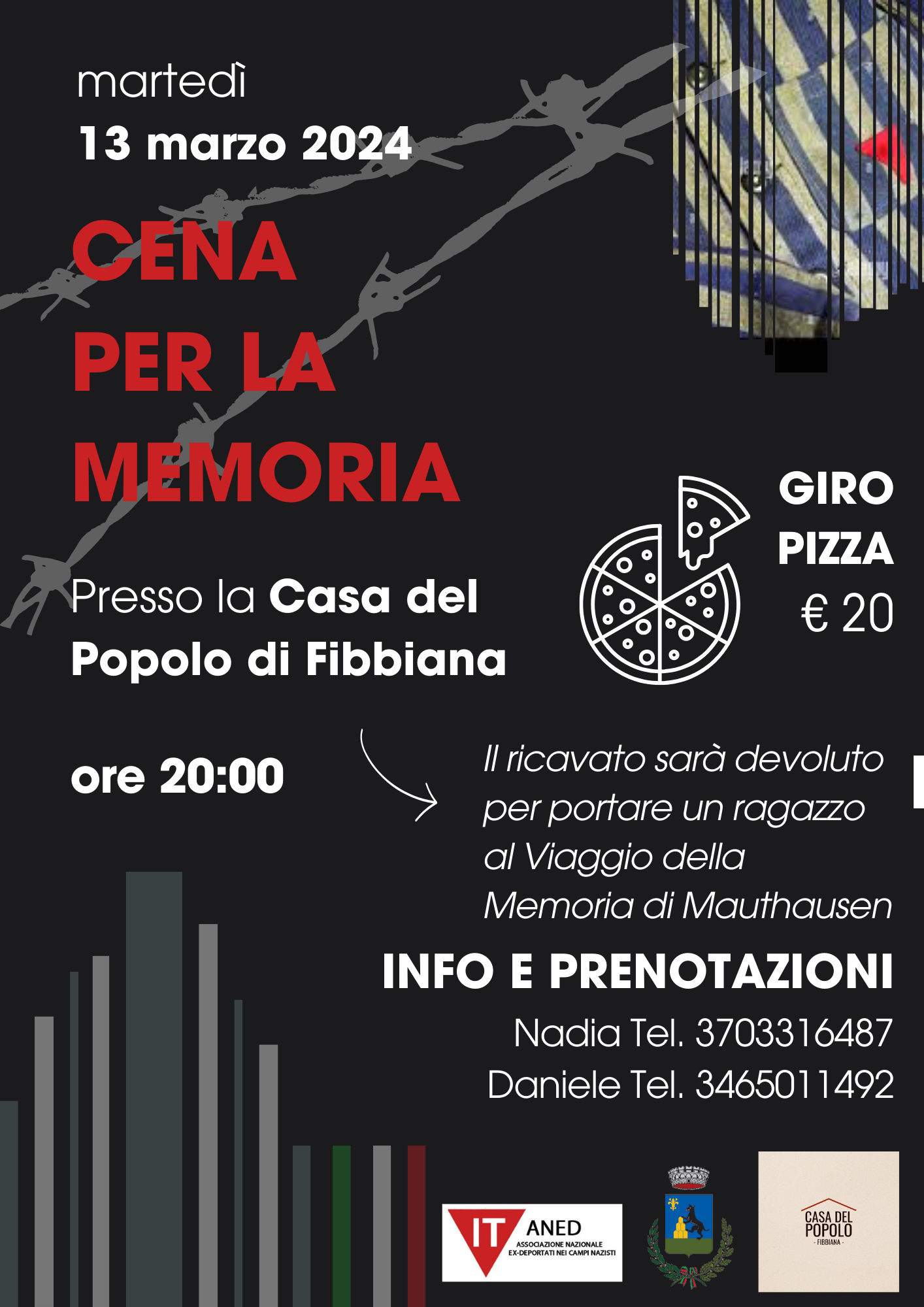 Mercoledì 13 marzo, presso la Casa del Popolo di Fibbiana, si terrà la "Cena per la memoria". L'evento organizzato da Aned, Associazione Nazionale Ex Deportati dell'Empolese Valdelsa, è in programma alle ore 20. Nella locandina altre informazioni e i contatti per le prenotazioni.