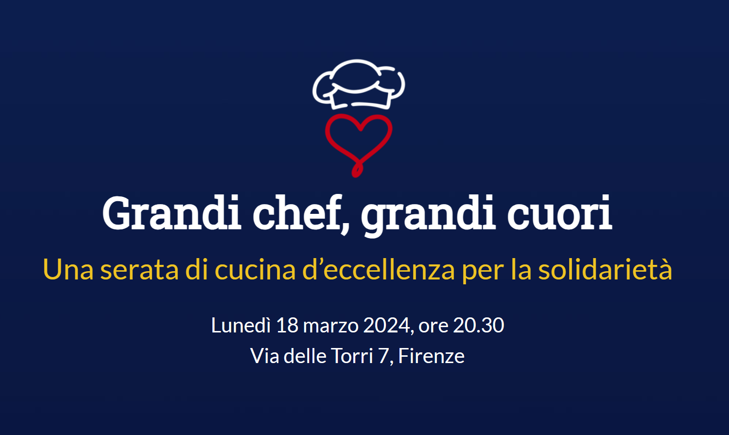 Il 18 marzo al Centro Le Torri (via delle Torri 7, Firenze) si svolgerà una serata speciale: il menu sarà composto da sei portate, create da altrettanti chef, anche stellati: Françoise Authom, Gabriele Andreoni, Carlo Mazzola, Giuseppe Papallo, Vito Mollica e Maria Probst."Siamo onorati di contribuire a questa serata speciale per una causa così importante. L'amore per la cucina ci unisce per fare la differenza" affermano gli chef.