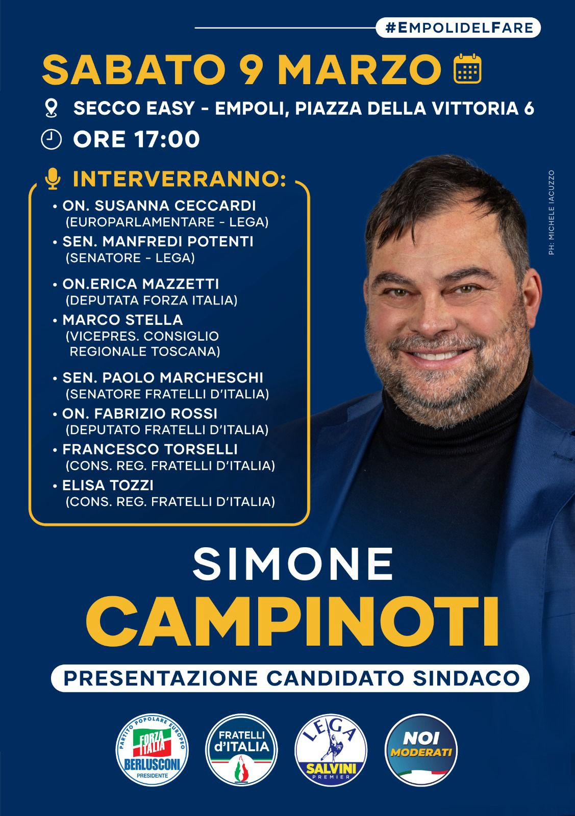 Questa fine settimana verrà presentato il candidato del centrodestra per Empoli, Simone Campinoti. A supportare l'evento, che si terrà al Secco Easy di piazza della Vittoria alle 17 questo sabato, i big dei 4 partiti di governo ed altri esponenti di rilievo del centrodestra: