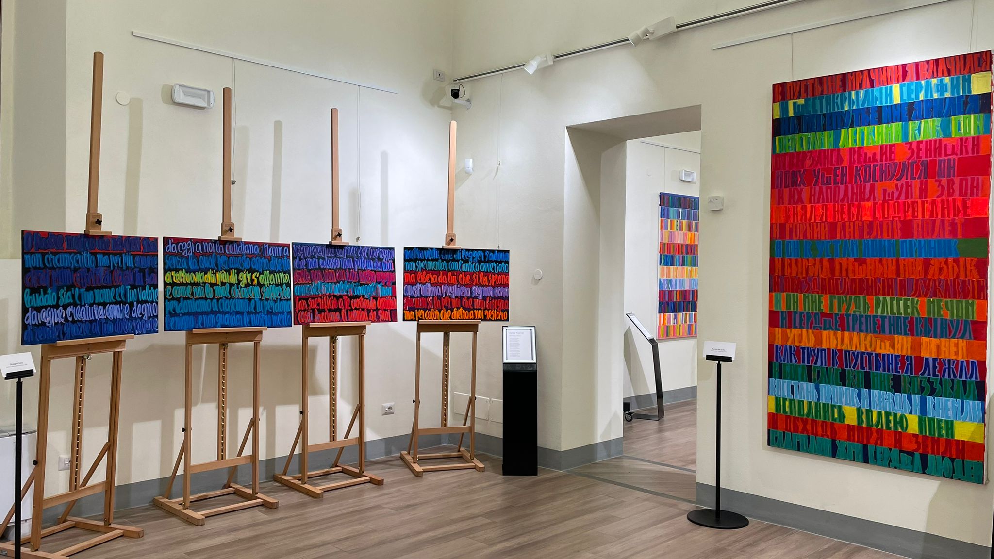 La curatrice, Silvia Pampaloni, spiega che le opere in mostra propongono “una relazione che sta molto a cuore all’artista, la relazione tra arte, poesia e colore. In quest’occasione, per il luogo in cui sarebbe stata ospitata questa mostra, Mira ha realizzato un polittico dedicato a Dante Alighieri