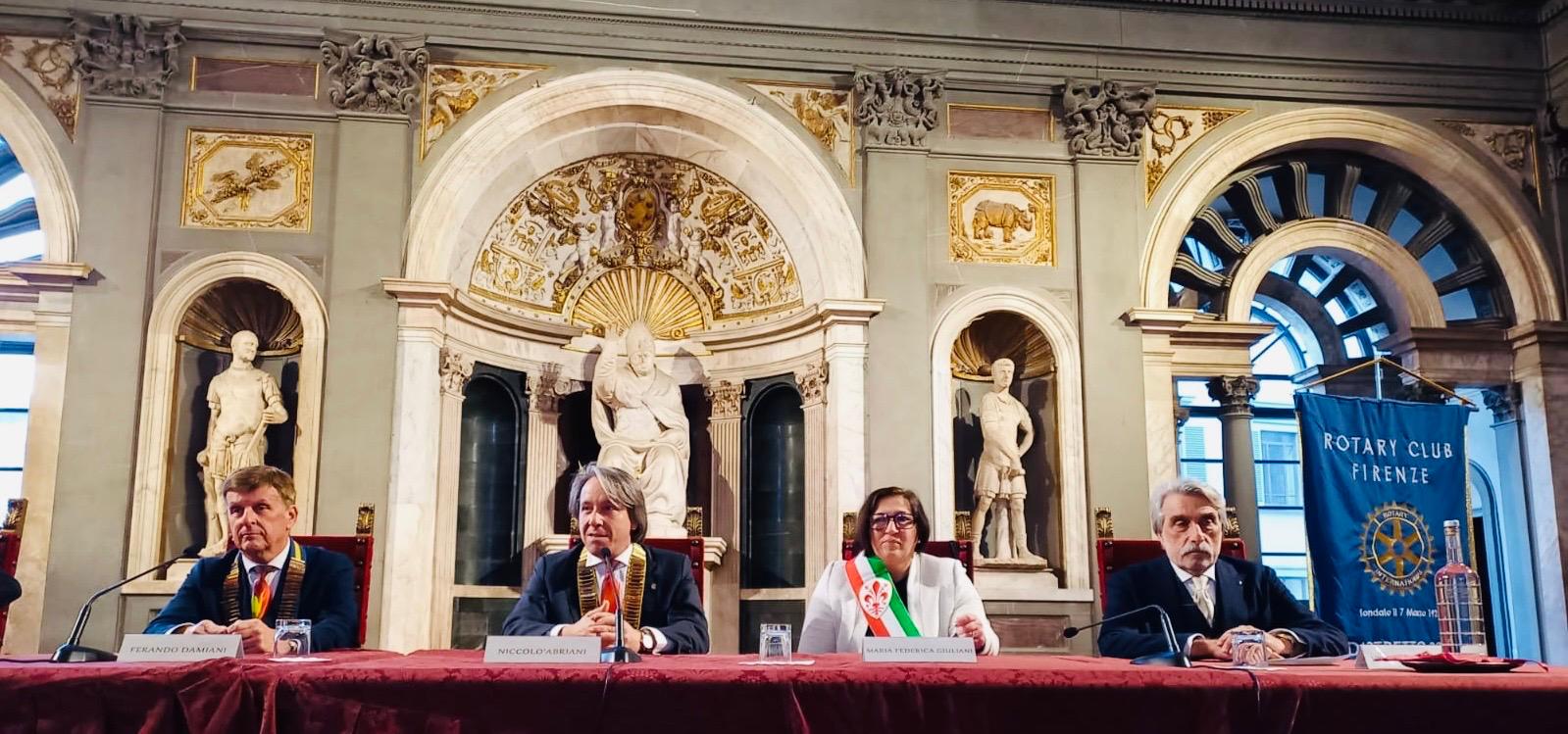 È questo l'impegno con cui il Rotary Club Firenze intende avviare le celebrazioni del centenario della sua nascita, avvenuta nel 1925. L'iniziativa, che gode del patrocinio di Regione Toscana, Comune di Firenze e Città metropolitana, è stata illustrata ieri pomeriggio nel Salone dei Cinquecento di Palazzo Vecchio. Con l'assessora Maria Federica Giuliani, il governatore del distretto Rotary della Toscana Fernando Damiani, il presidente del Rotary Firenze Niccolò Abriani, Simone Ferri Graziani president incoming e Vincenzo di Nardo responsabile progetti del Rotary Firenze.