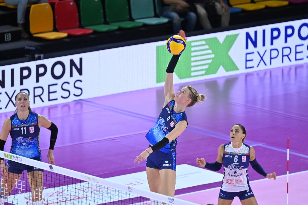 Coach Parisi, con l’acciaccata Graziani in panchina con la maglia di secondo libero, schiera Battistoni in palleggio, Kipp opposto, Ishikawa e Alsmeier in banda, Acciarri e Mazzaro al centro e Leonardi nel ruolo di libero, mentre Bregoli risponde con Malinov in regia, Anthouli opposto, Omoruyi e Kingdon in posto quattro, Zakchaiou e Gray al centro e Spirito libero.