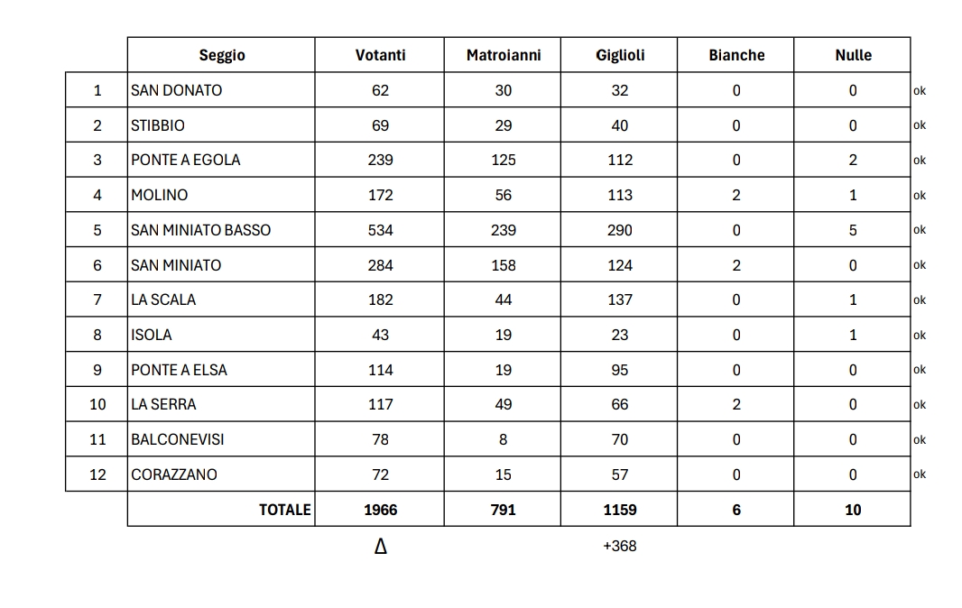 Giglioli vince nelle sezioni di San Donato, Stibbio, Molino d'Egola, San Miniato Basso, La Scala, Isola, Ponte a Elsa, La Serra, Balconevisi e Corazzano.