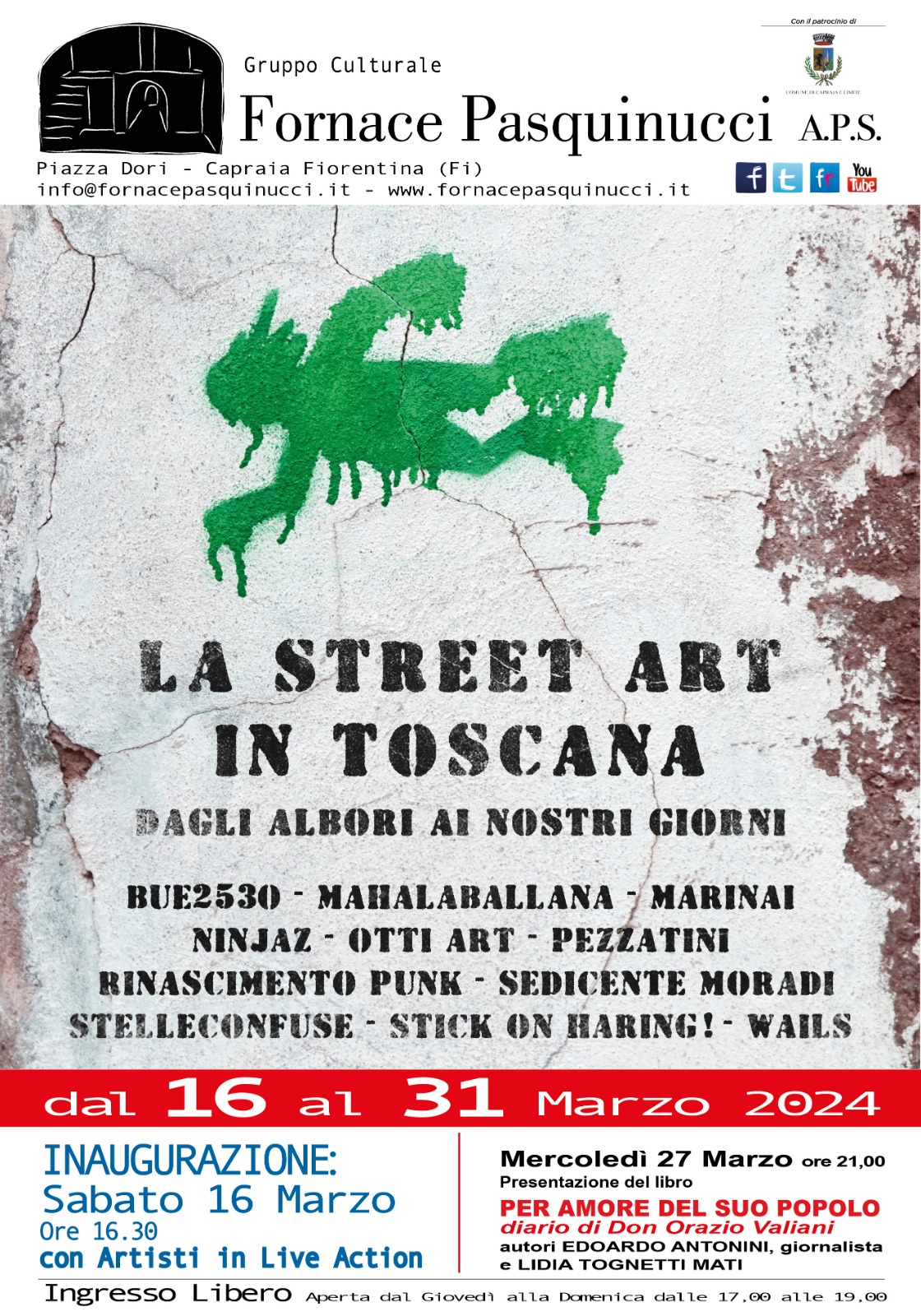 Per la prima volta il Gruppo culturale Fornace Pasquinucci presenta un’esposizione sulla street art in Toscana che ripercorre la sua storia. Saranno esibite opere dei "pionieri" Aroldo Marinai (primo stencil artist in Europa) e Lorenzo Pezzatini, insieme a quelle di alcuni degli street artist attuali più attivi e significativi. L’evento curato da Stelleconfuse e Mattia Desideri può essere ben riassunto dalle parole dell’artista americana Jenny Holzer che diceva a proposito dell’arte urbana: "Questa è arte fatta in segreto per il pubblico. È arte che si suppone non debba esistere. È arte su problemi seri, messa in posti dove tutti possono vederla. È arte talmente bella per mostrare quanto le cose potrebbero essere fantastiche…".