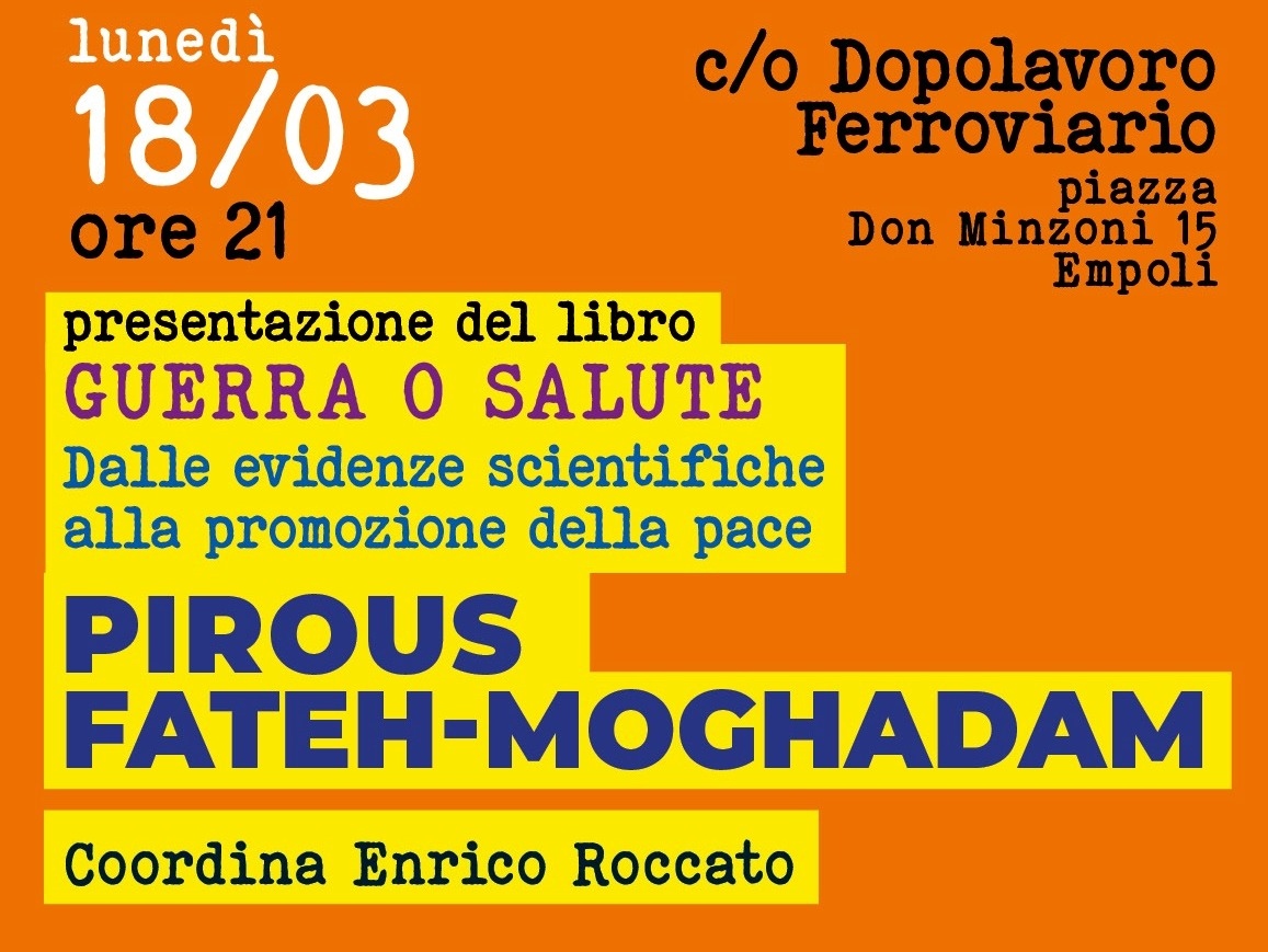 Prosegue il ciclo di incontri ‘conoscere per costruire la pace’ organizzato dal comitato ‘Empoli per la pace’. Il prossimo appuntamento è in programma lunedì prossimo, 18 marzo, alle ore 21 presso il dopolavoro ferroviario di piazza Don Minzoni. Ospite sarà il dottor Pirous Fateh-Moghadam che presenterà il suo libro ‘Guerra o salute’.