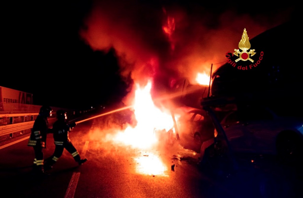 Bisarca e auto in fiamme nella notte in autostrada