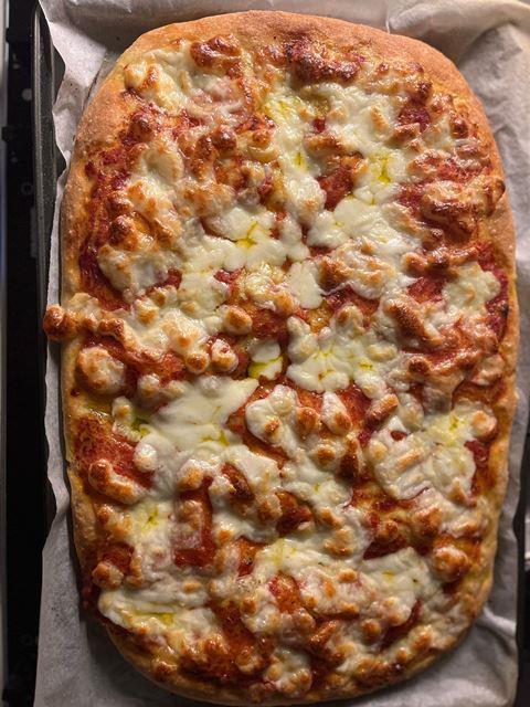 In una ciotola mescolate, con un cucchiaio, la farina, il lievito di birra, l’acqua, l’olio e infine il sale. Date una bella mescolata, non importa che sia omogeneo. Sarà un impasto molle e appiccicoso, va bene così. Coprite e lasciate riposare per 30 minuti in modo che la maglia glutinica si rilassi. Riprendete la ciotola, con le mani unte d’olio, prendete l’impasto e versatelo su una spianatoia con poca farina di semola e cercate di fare qualche piega di rinforzo. Coprite e lasciate lievitare per 2 ore, vedrete qualche bella bolla in superficie. Ottimo! Capovolgete la ciotola con l’impasto su una spianatoia con farina di semola. Aggiungete altra farina su tutta la superficie e con le dita, formate dei buchi, lungo i bodi e poi al centro. Oliate bene una teglia e posate delicatamente l’impasto all’interno. Tirate un po’ gli angoli dell’impasto fino ricoprire l’intera superficie della teglia. Condite con passata di pomodoro e olio evo. Infornate a 250 gradi per 10/12 minuti, in forno statico, nella parte bassa. Poi estraete la teglia, condite con mozzarella e infornate per altri 5/6 minuti nel piano centrale. Se volete farla il giorno prima vi basterà usare 5 gr di lievito di birra fresco, oppure 2 gr di quello secco. Terminato l’impasto, le pieghe e la lievitazione di 2 ore potete metterlo in frigo per 24 ore. Il giorno dopo vi basterà tirarlo fuori del frigo e lasciarlo a temperatura ambiente per due o tre ore. Poi seguite la ricetta. Mettete teglia e lasciate lievitare come indicato nei passaggi.