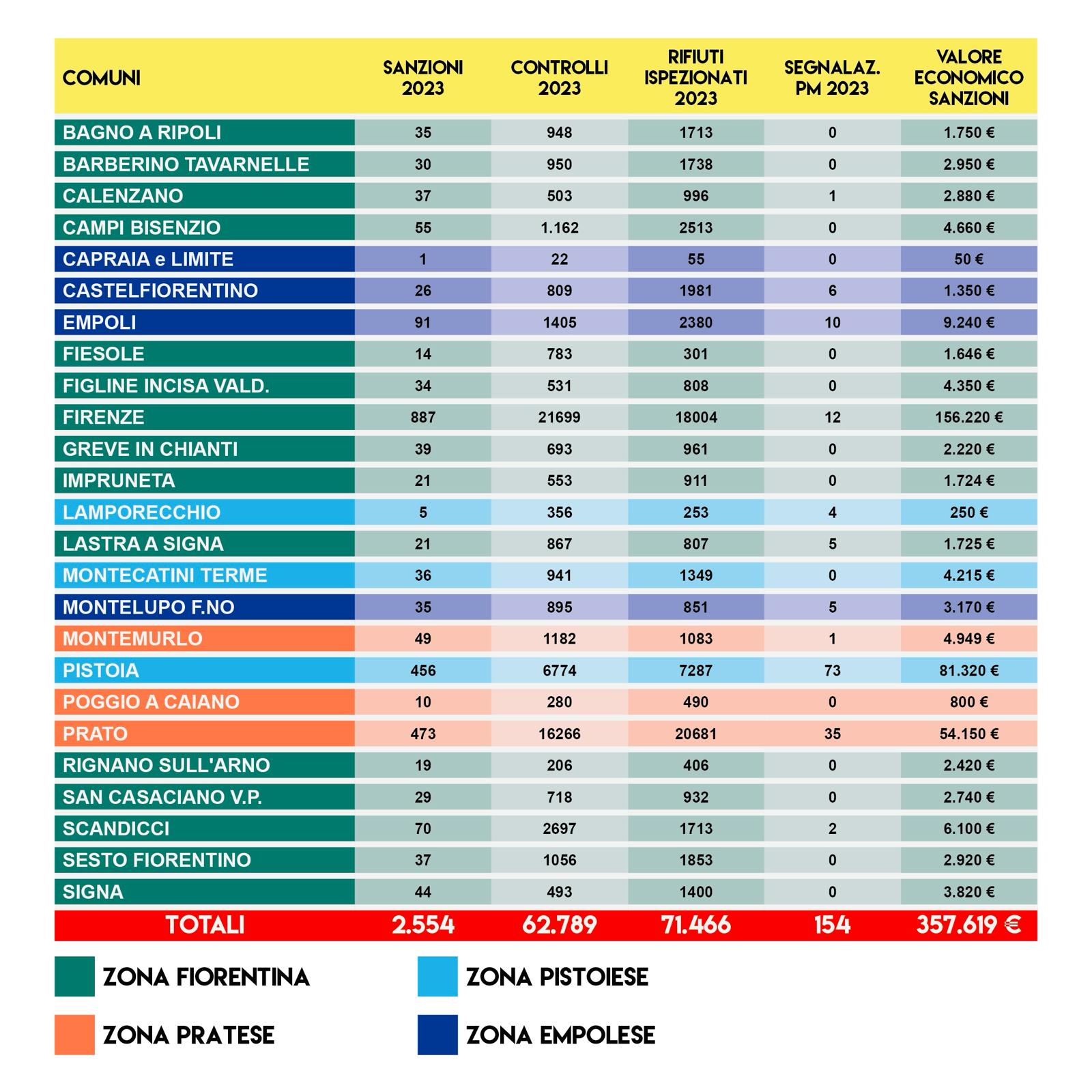 Nell’intera provincia di Firenze, area in cui sono numerosi i Comuni che hanno attivato il servizio degli ispettori ambientali, i controlli effettuati nel 2023 sono stati 34.215, con l’ispezione di 35.309 rifiuti e 1.377 sanzioni elevate per un valore economico di 198.375 euro.