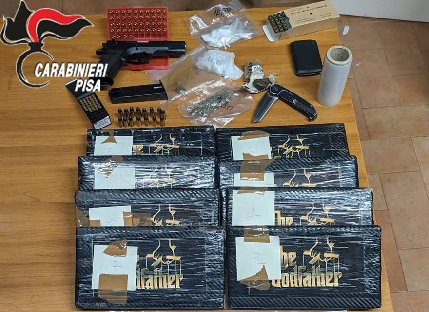 E' stato trovato con 9 kg di cocaina raccolti in 8 involucri marchiati 'Godfather' (Il Padrino, la pellicola di Scorsese) oltre ad avere una pistola calibro 9 con munizioni, un coltello a serramanico e 4.200 euro in contanti. Per questo un uomo è stato arrestato dai carabinieri del Radiomobile di Pisa lungo l'Aurelia a Vecchiano, durante un controllo stradale. L'uomo era alla guida della sua auto, con un 'importante' carico. Dagli accertamenti seguiti anche nell'abitazione della persona, sono state trovate e sequestrate altre munizioni e 1.200 banconote contraffatte. Dopo il sequestro di tutto quanto rinvenuto, l'uomo è finito in carcere al Don Bosco a disposizione dell'autorità giudiziaria.