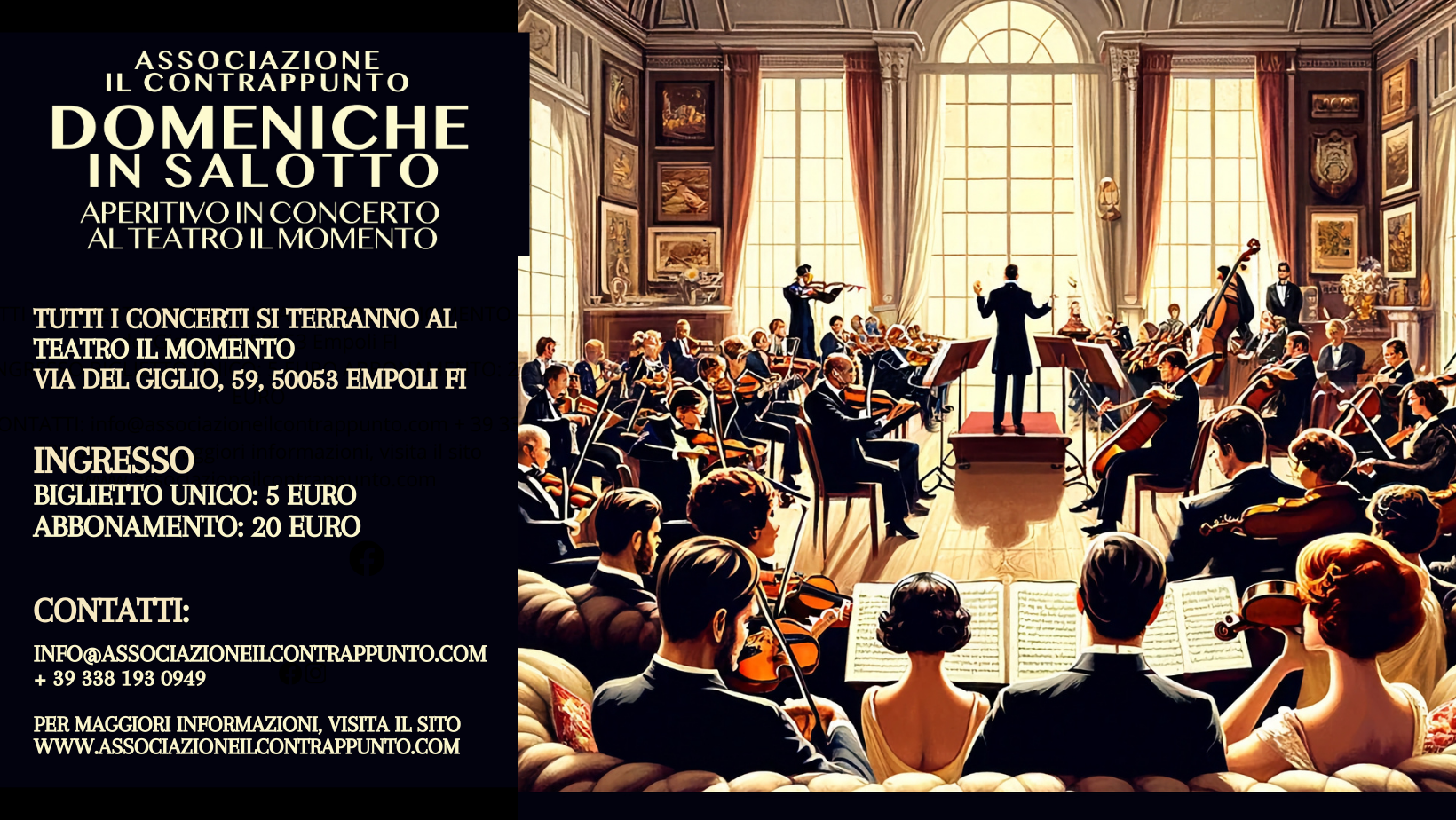 La rassegna musicale "Domeniche in salotto”, promossa dall'Associazione Il Contrappunto, si concluderà Domenica 24 Marzo alle ore 16.00 presso il Teatro Il Momento di Empoli. "Siamo felici per come è andata questa prima edizione di Domeniche in salotto" afferma il Maestro Damiano Tognetti, Presidente dell'Associazione Il Contrappunto, “La rassegna si concluderà con un brano principe della musica da camera, ideale per il salotto, come l’Ottetto in Fa magg. D 803 di Schubert, che sarà eseguito dai Solisti dell‘Orchestra da Camera Fiorentina. Dopo il concerto si brinderà anche al compleanno dell’Associazione che compie tre anni, aspettando un’estate piena di grandi novità, in particolar modo con un’affascinante sorpresa." Il prezzo del biglietto, fissato con un importo di 5 Euro, è pagabile direttamente all'ingresso. È gradita la prenotazione al numero + 39 338 193 0949 e +39 3381065260.