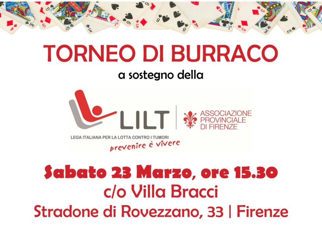 Una giornata per sostenere la lotta contro i tumori giocando a burraco. È l’iniziativa promossa da Lilt Firenze in programma sabato 23 marzo a Villa Bracci con inizio alle 15.30.
