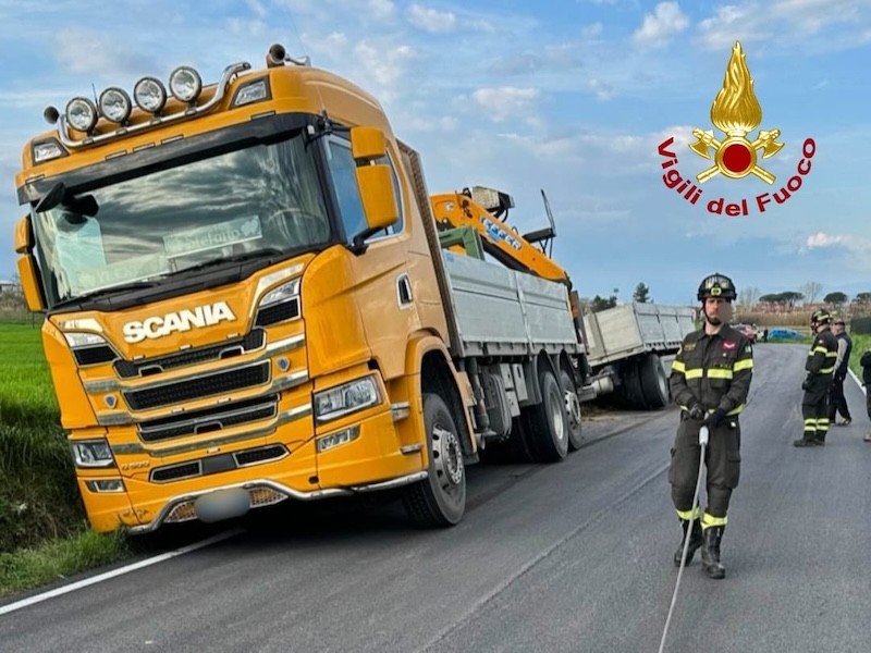 Un camion è finito con le ruote in un fossato a San Miniato, lungo via Maremmana. Il fatto è avvenuto alle 15.30 di oggi, martedì 19 marzo. Sul posto i vigili del fuoco di Pisa.