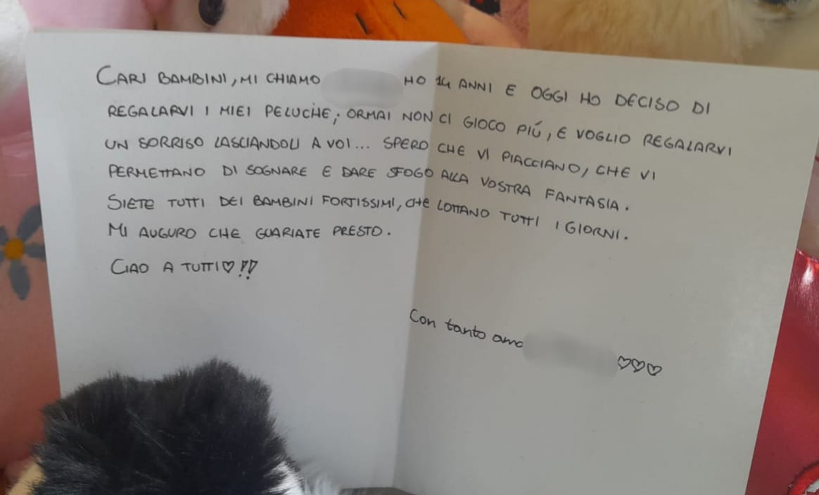 Un gesto che ha commosso gli operatori che hanno compreso quanto Gaia tenesse a fare felici i bambini meno fortunati rispetto a lei, privandosi di un ricordo dell’infanzia per donarlo a loro. Un sentimento di generosità e di altruismo che si evince anche dalle belle parole che la ragazzina ha scritto nel biglietto di accompagnamento: “Cari bambini, mi chiamo Gaia, ho 14 anni e oggi ho deciso di regalarvi i miei peluche; ormai non ci gioco più e voglio regalarvi un sorriso lasciandoli a voi…Spero che vi piacciano, che vi permettano di sognare e dare sfogo alla vostra fantasia. Siete tutti dei bambini fortissimi, che lottano tutti i giorni. Mi auguro che guariate presto!! Con tanto amore Gaia”.