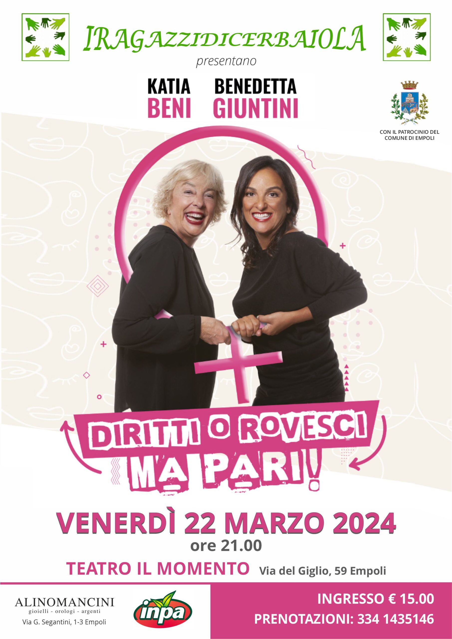 Una serata per i ragazzi di Cerbaiola ma anche una serata dedicata alle donne. Questo l'appuntamento benefico in programma venerdì 22 marzo, alle ore 21, al Teatro il Momento di Empoli con lo spettacolo "Diritti o rovesci ma pari!". Protagoniste sul palco Katia Beni e Benedetta Giuntini, in uno spettacolo esilarante e allo stesso tempo di riflessione su pari opportunità, stereotipi di genere e diritti violati. Ingresso della serata 15 euro: il ricavato servirà a sostenere i ragazzi del centro diurno di Cerbaiola.