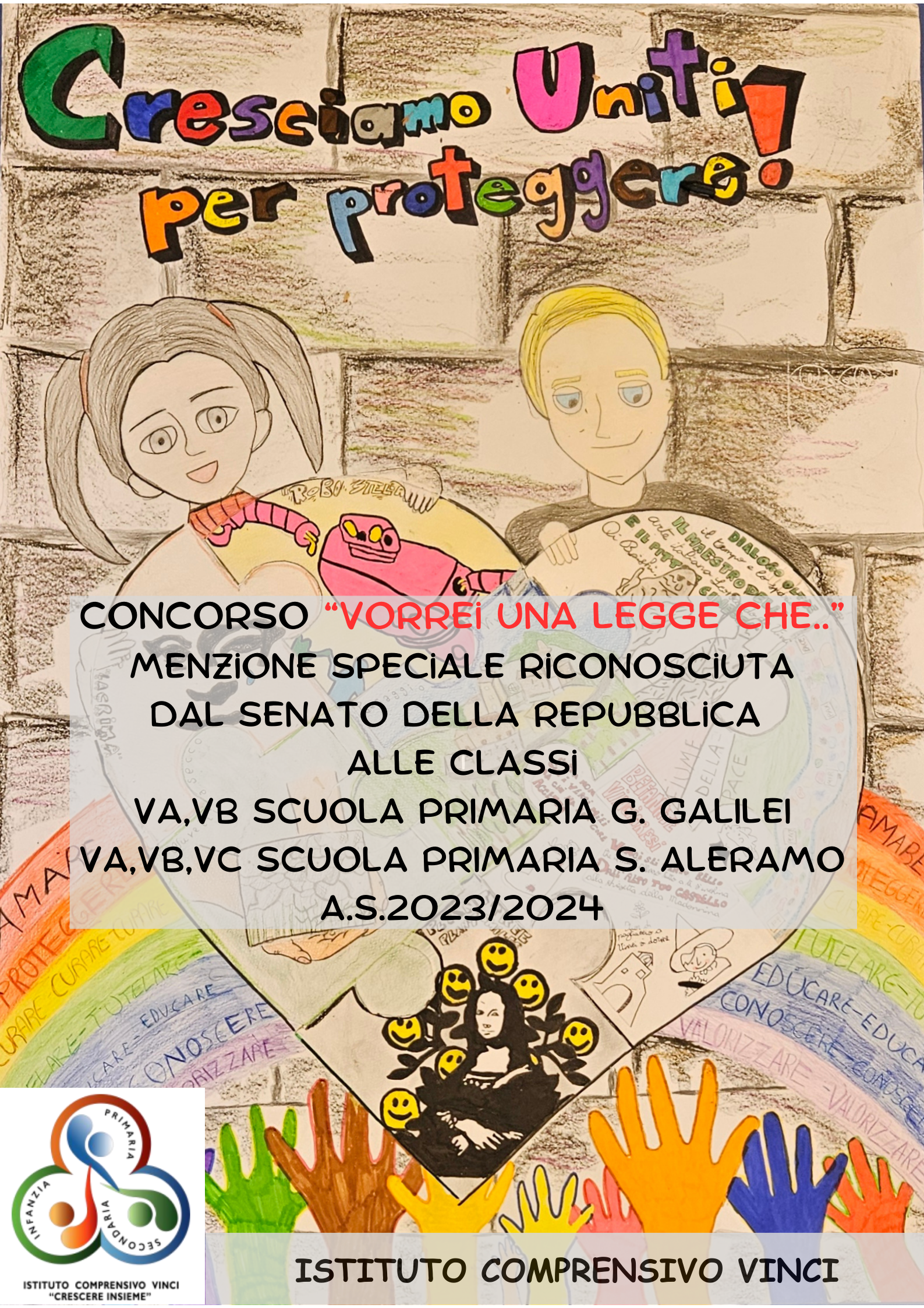 La Commissione di valutazione del concorso “Vorrei una legge che...” promosso dal Senato della Repubblica in collaborazione con il Ministero dell’Istruzione e del Merito, ha premiato l'Istituto Comprensivo di Vinci con una menzione speciale per il progetto presentato. La Commissione ha particolarmente apprezzato il lavoro svolto, complimentandosi per l'entusiasmo e la dedizione con cui le alunne e gli alunni delle classi quinte della Scuola Primaria G. Galilei e S. Aleramo, attentamente guidati dalle rispettive docenti, hanno seguito questo percorso formativo volto a far cogliere ai giovani l'importanza dei valori costituzionali, delle leggi, delle funzioni del Parlamento e del confronto democratico.